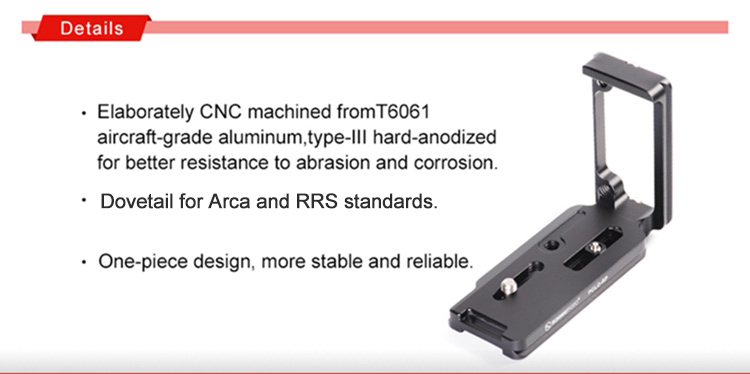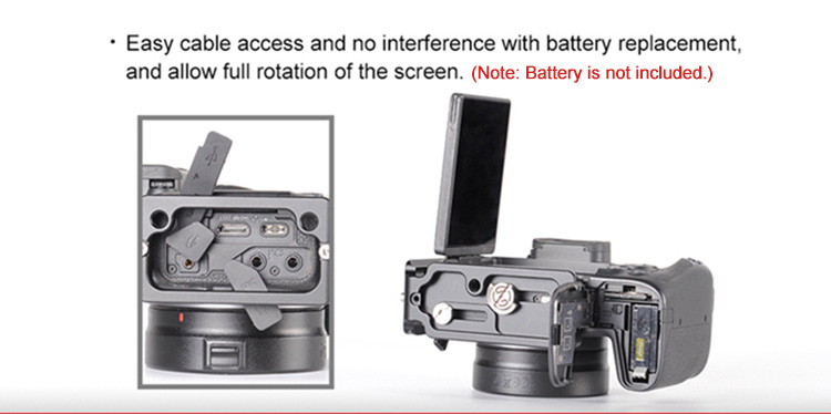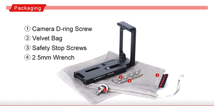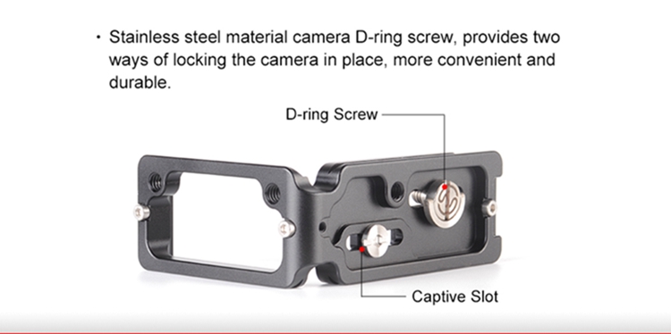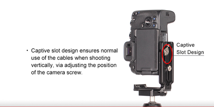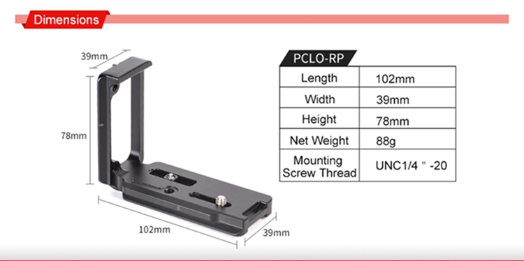 PCLO-RP is one dedicated L-bracket for Canon EOS RP, elaborately CNC machined one-piece structure, custom made for a perfect fit on this camera. Different from traditional L-brackets, the PCLO-RP has two points in stabilizing the camera to avoid shifting, and the captive slot design also ensures normal use of the cables via adjusting the position of the camera screw.