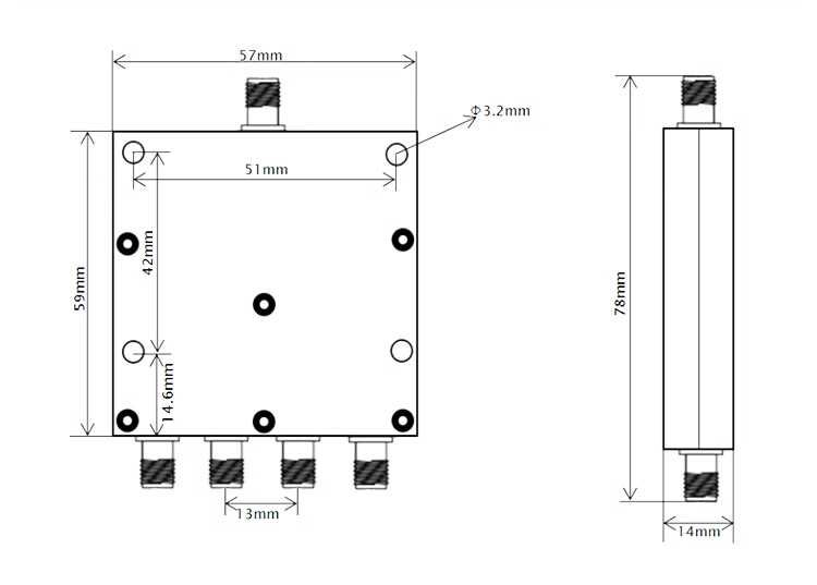 - Isolation: ≥15dB (at 500M-800MHZ); ≥20dB (at 800M-6000MHZ)