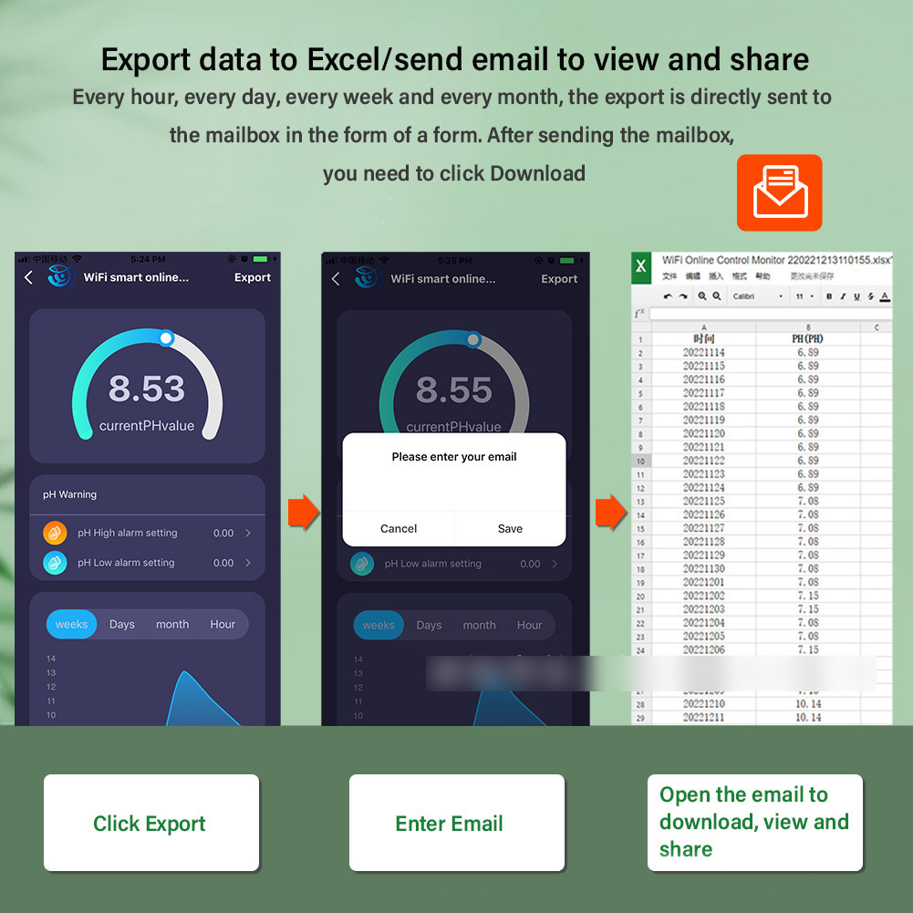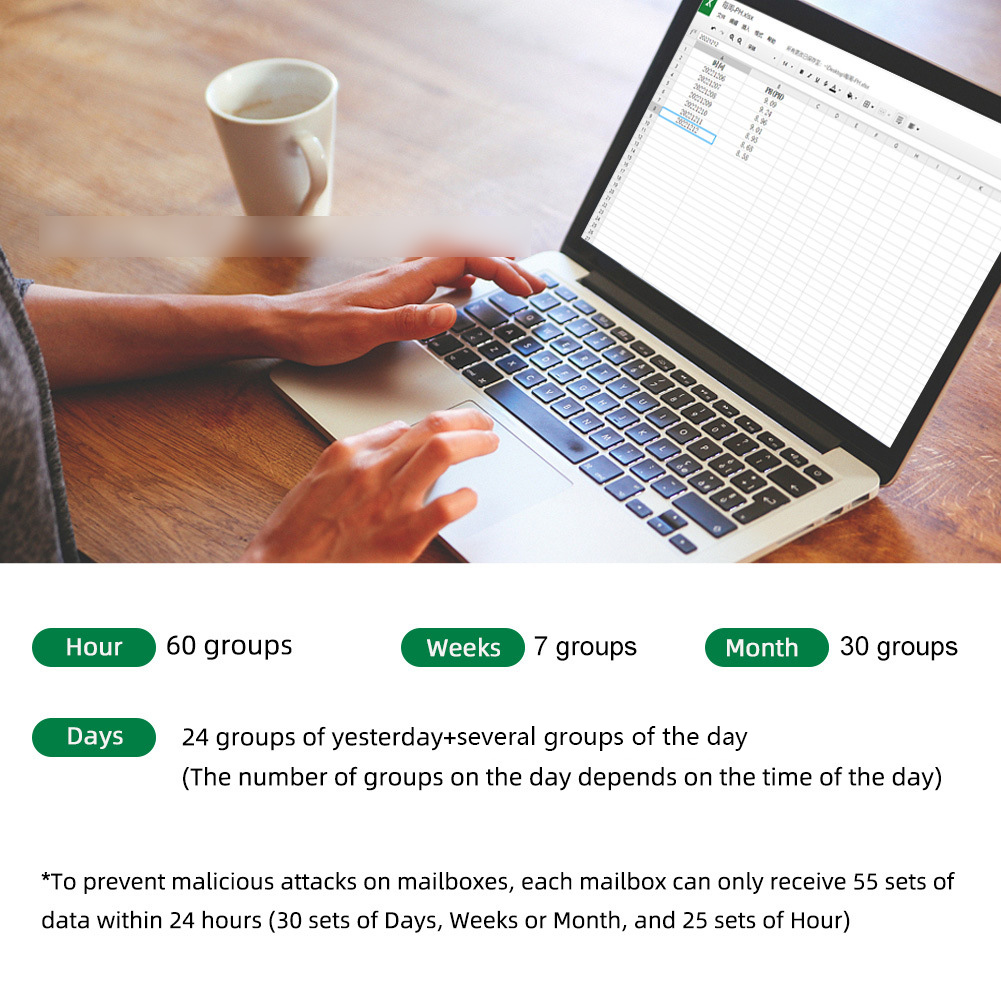 - Data automatically stored and saved. Data is received at all times, data curve graphs is provided analysis. You can receive excel file in your mobile phone or PC.