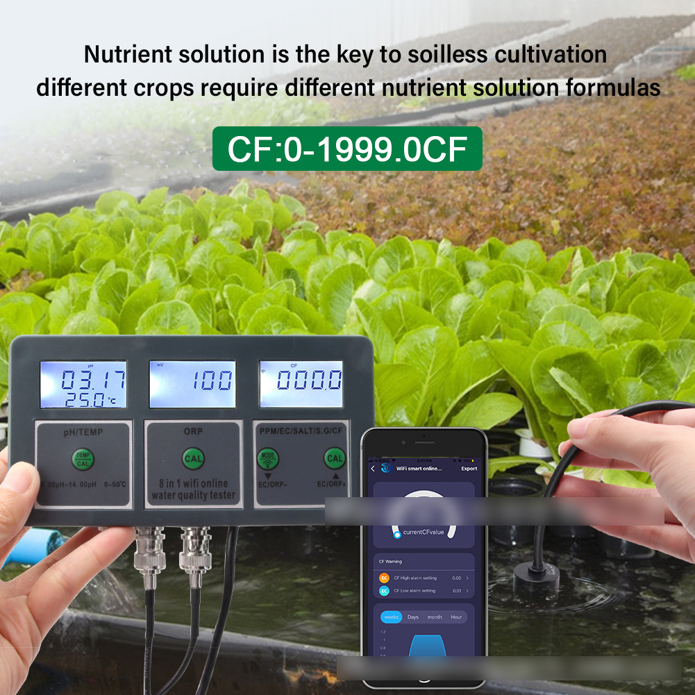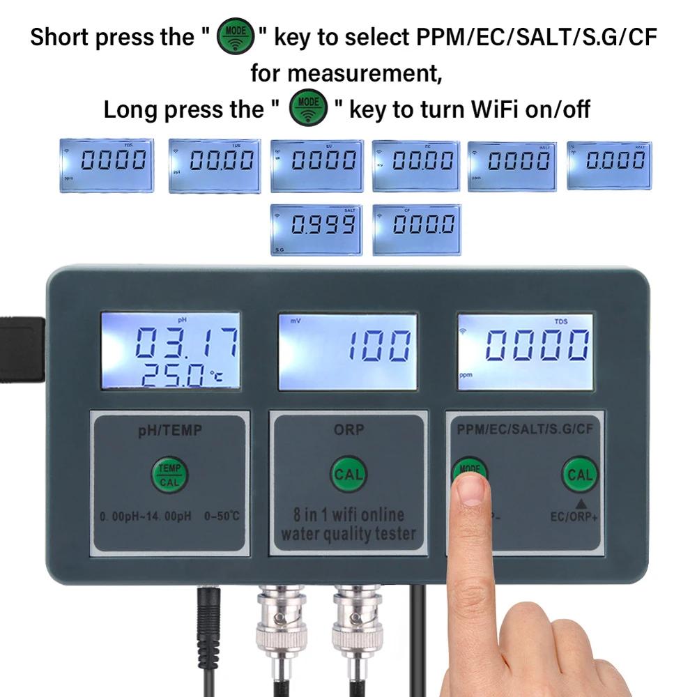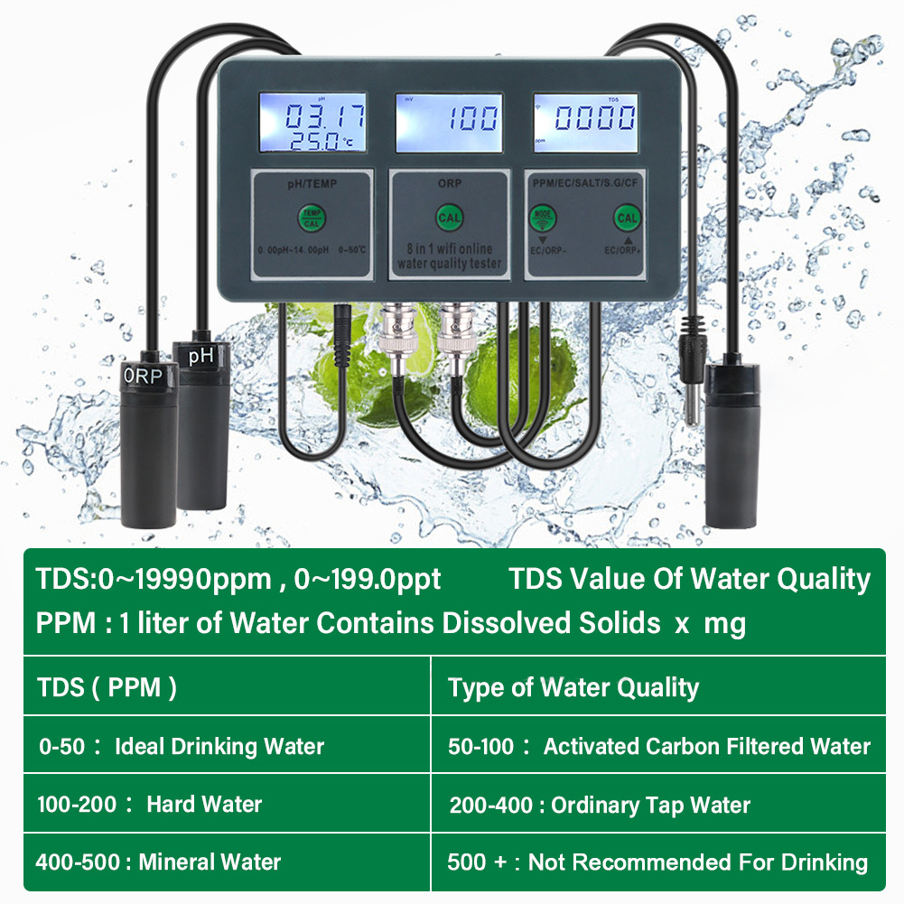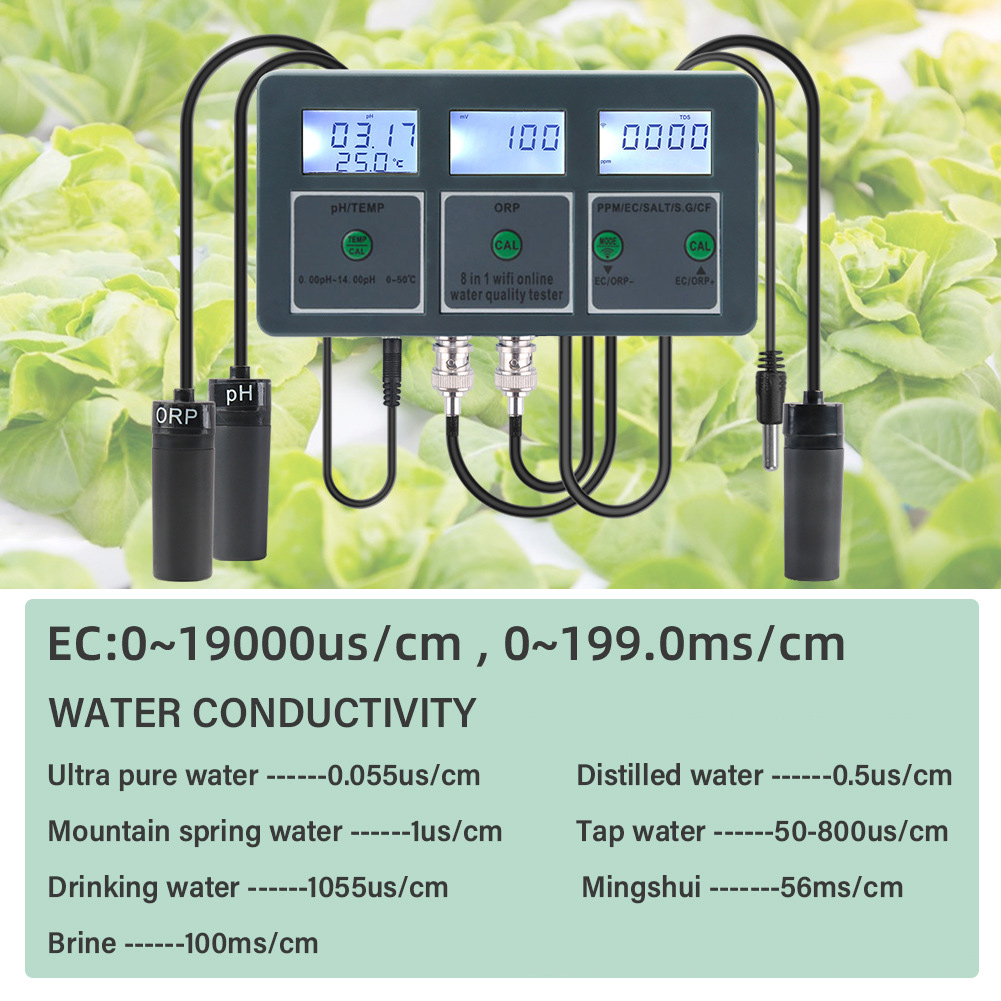 - This is an 8-in-1 water quality tester, which can test the S.G / PH / EC / salinity / ORP / TDS / CF / Temperature values of water. It is widely used in fish-tanks, hydroponics and other occasions to provides fine aquatic environment for animals and plants.