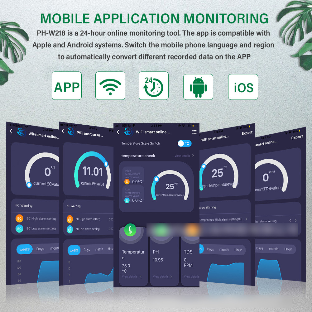 - WiFi connect and data transfer, download for Tuya Smart APP and enter your account. Real time monitoring water quality on mobile phones.