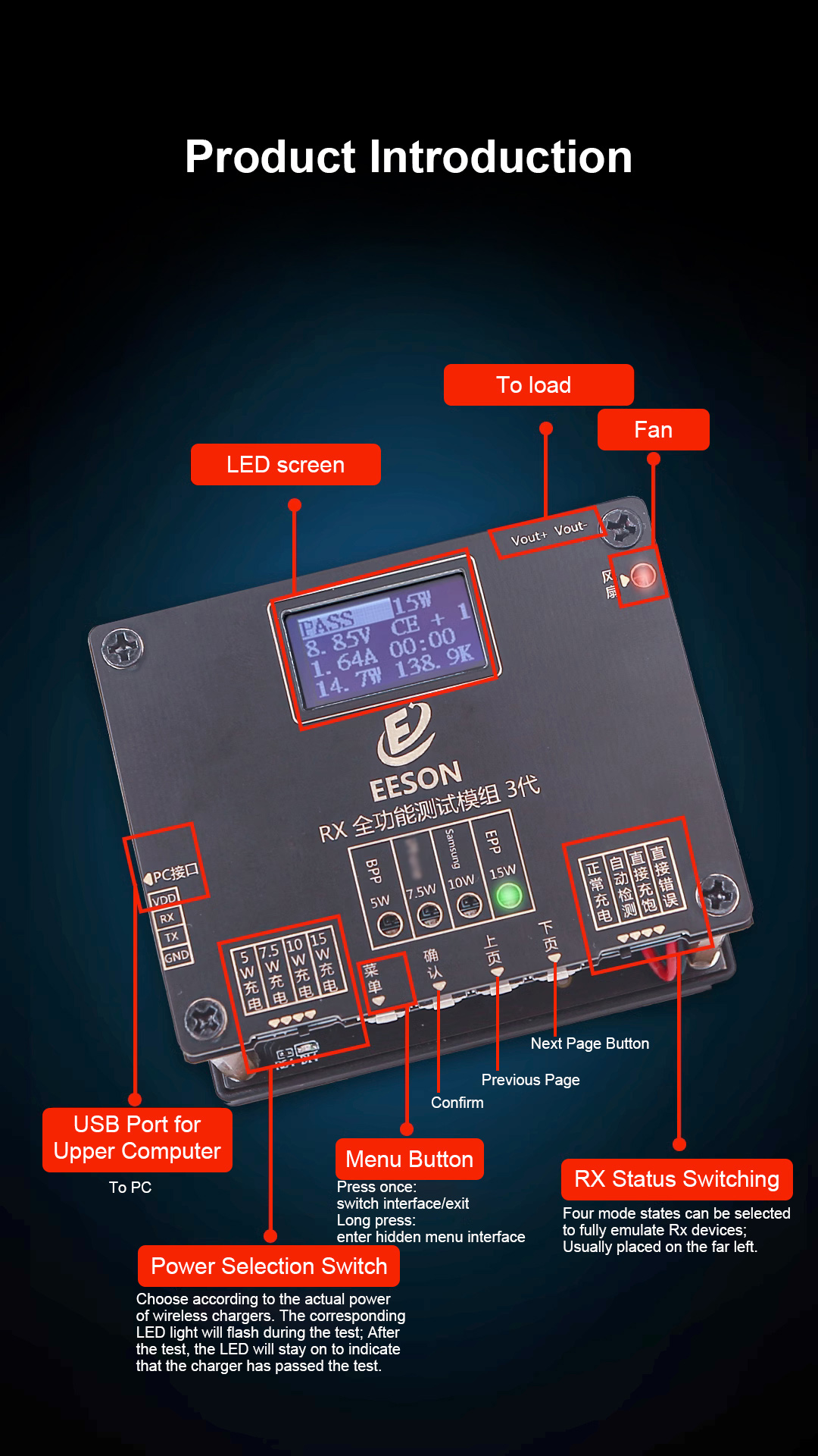 * Multi-function button: It can measure conventional parameters of wireless chargers such as output voltage and current. It is also optimized for the relevant test items in the development process of engineers, adding many additional functions.