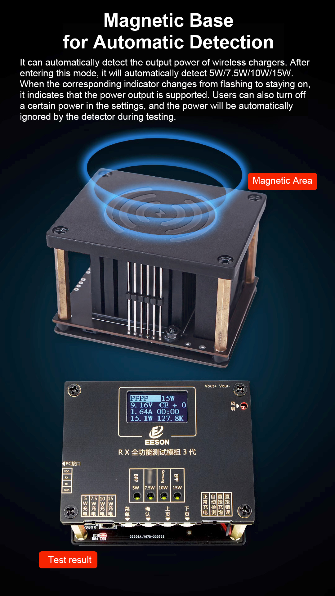 * Full-featured wireless charging tester with a magnetic base: It can measure 5W, 7.5W, 10W and 15W. It is compatible with 99.9% of mainstream schemes on the market.