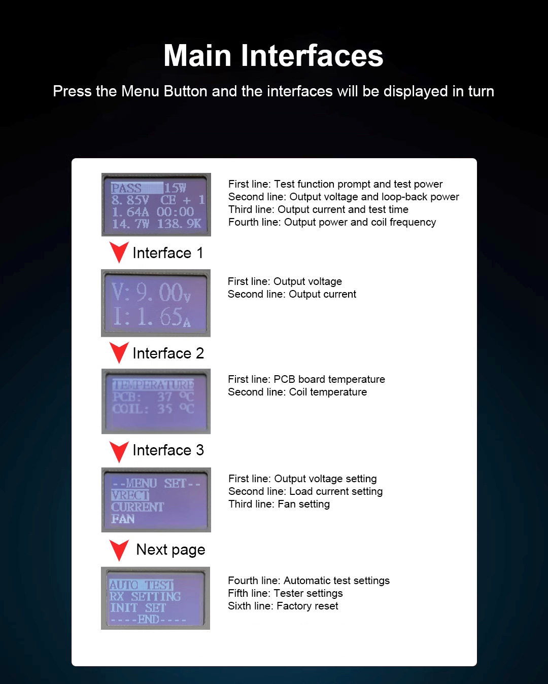 * Stable performance and upgrade temperature control system. No additional power supply is required for the tester. Put it on a wireless charger and it can work very conveniently. Upgraded heat sink and an intelligent temperature control fan. The starting and stopping temperature of the fan can be set, to ensure fast heat dissipation and low temperature operation of the module. It can be used to meet the aging test requirements of production lines.