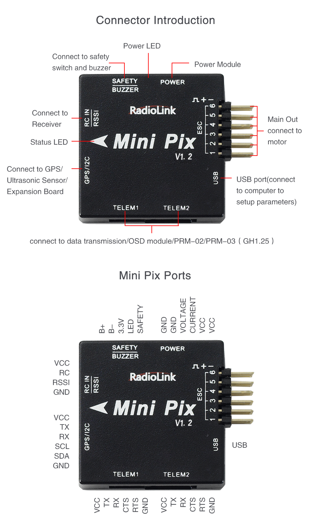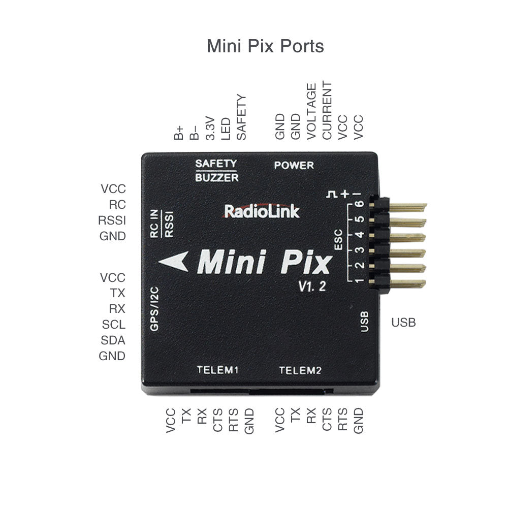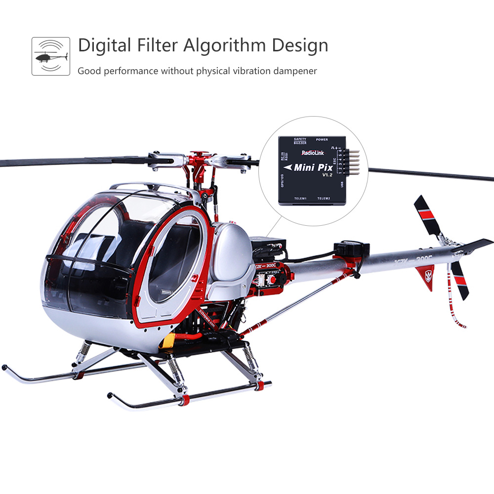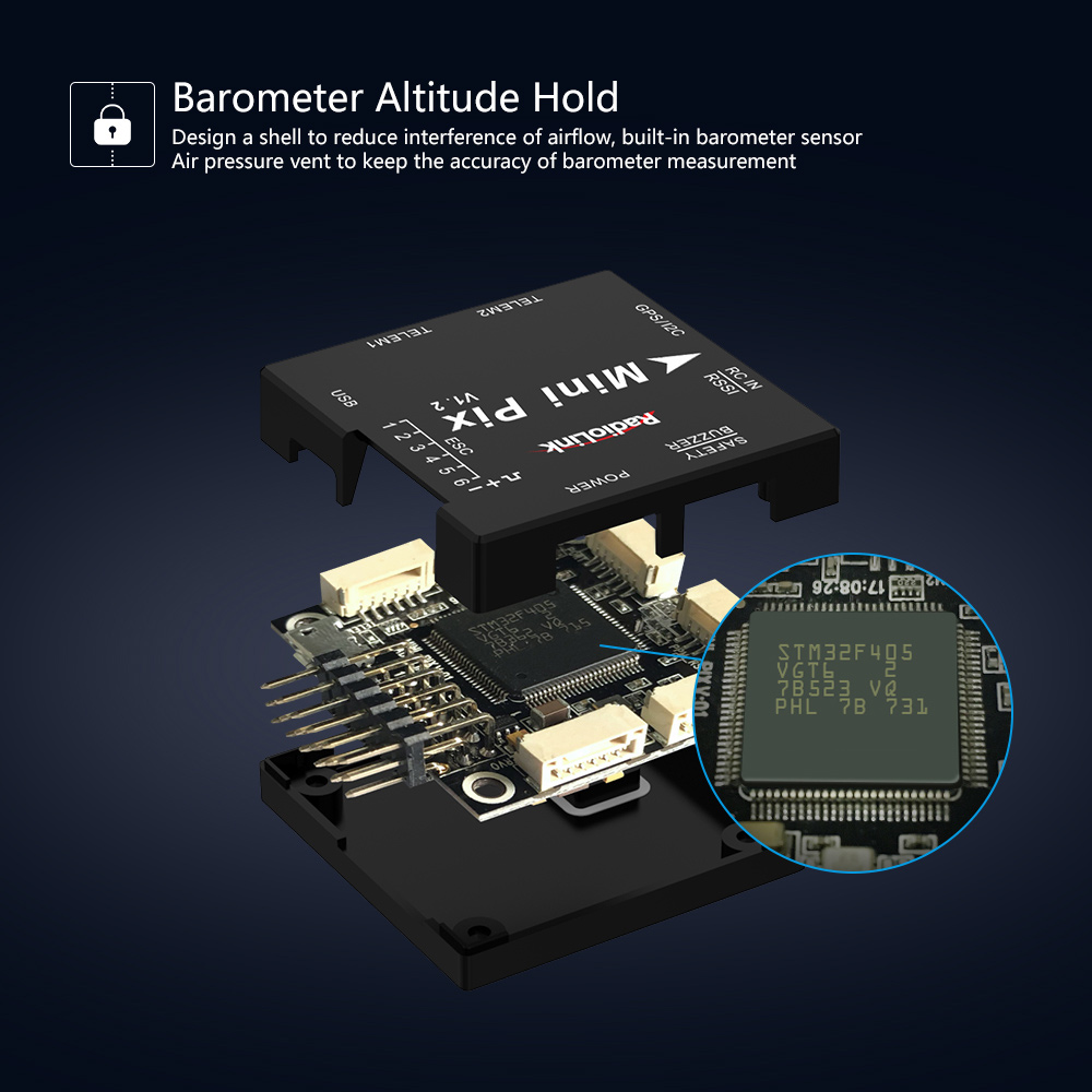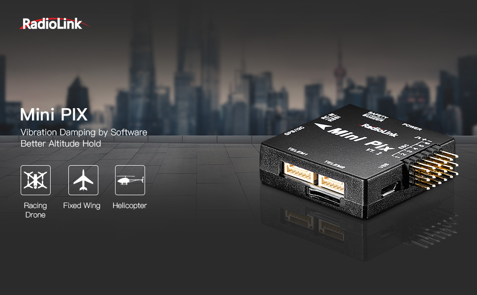 - Digital Filter Algorithm: Radiolink mini pix flight controller design by digital filter algorithm for damped vibration, your drone still have a good performance even though without physical vibration dampener.