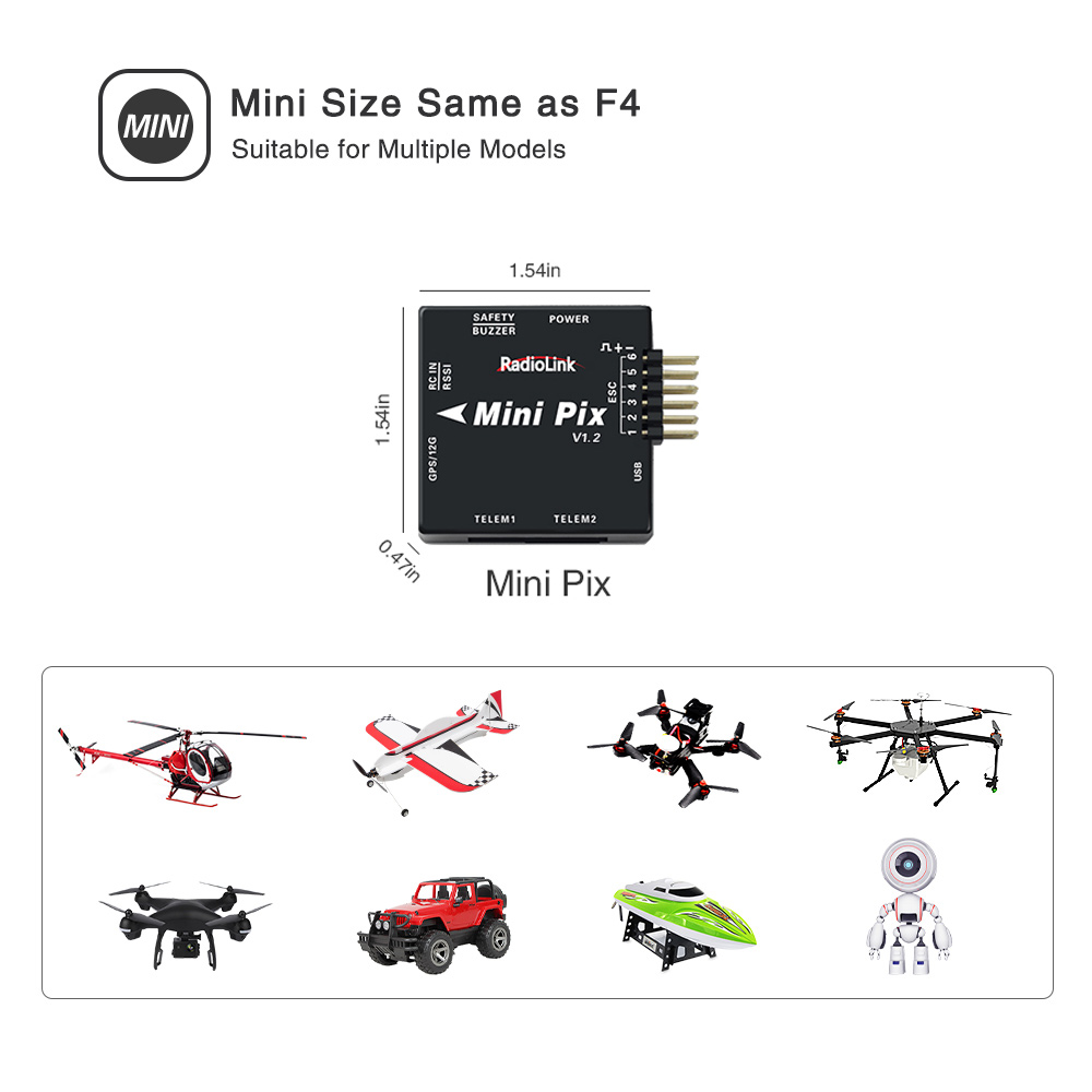 - Mini Size: New layout and full functions for PIXHAWK, same mini size as F4 FC. Suitable for mini racing drone, fixed wing, helicopter, multirotor and RC boat and car.