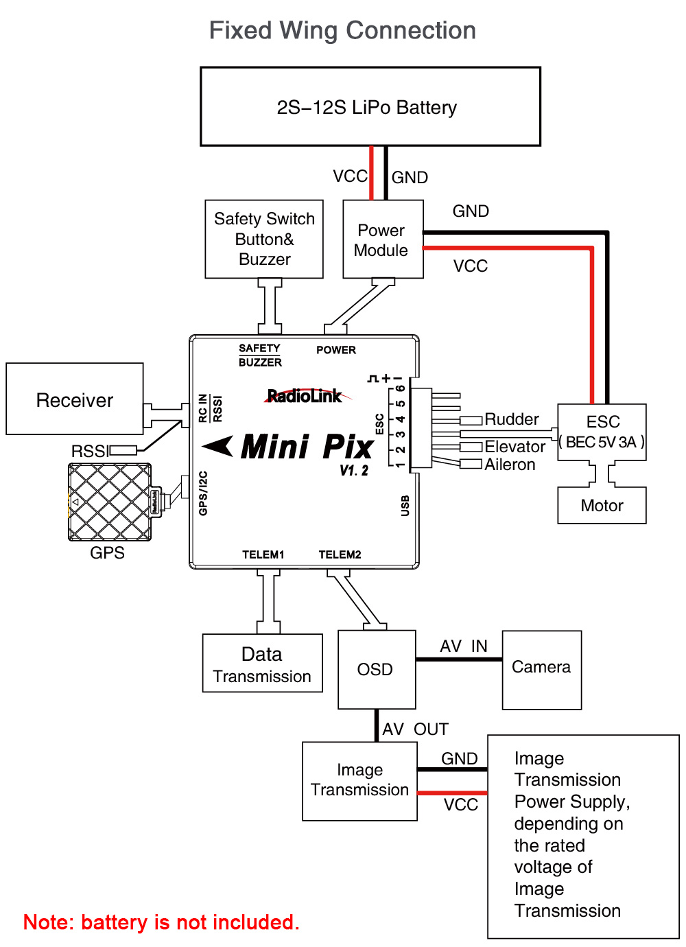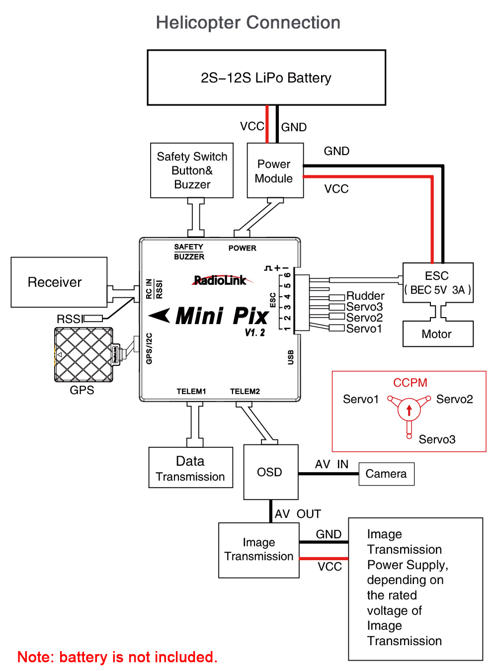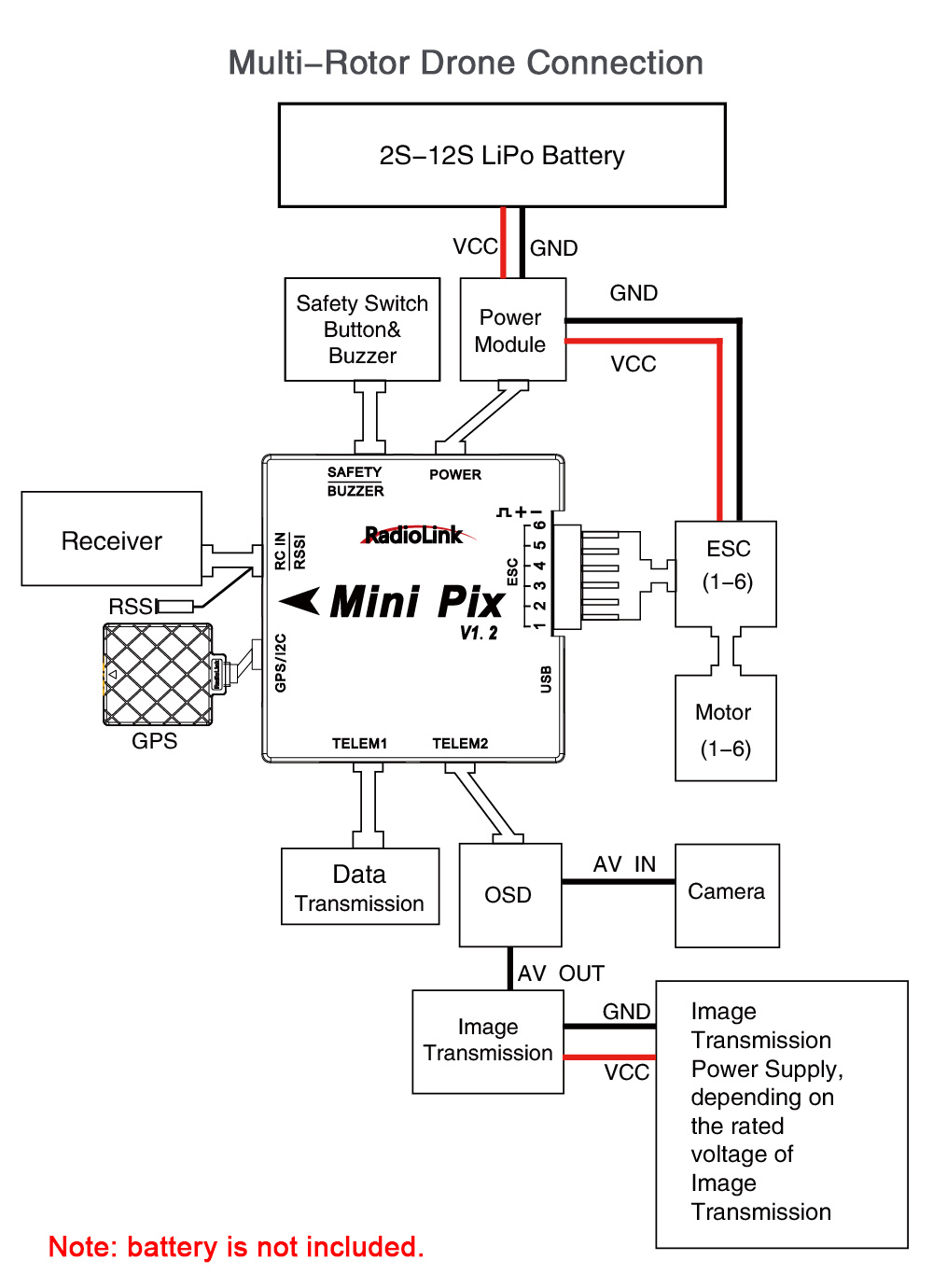 - Battery is not included. 2-12S battery is supported by its power module.