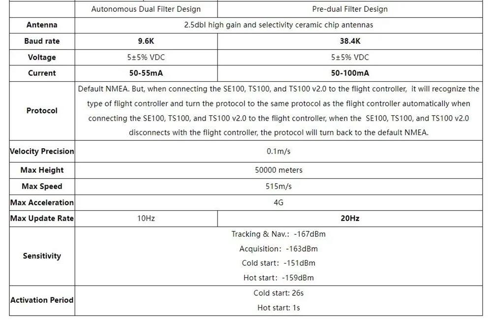 - Protocol: default NMEA protocol, automatically synchronizes the port protocol type (baud rate 115200) of the flight controller when connected; After disconnecting from the flight control and the button battery in the GPS is depleted (usually around 2 hours), the GPS protocol will revert back to the factory default NMEA protocol.
