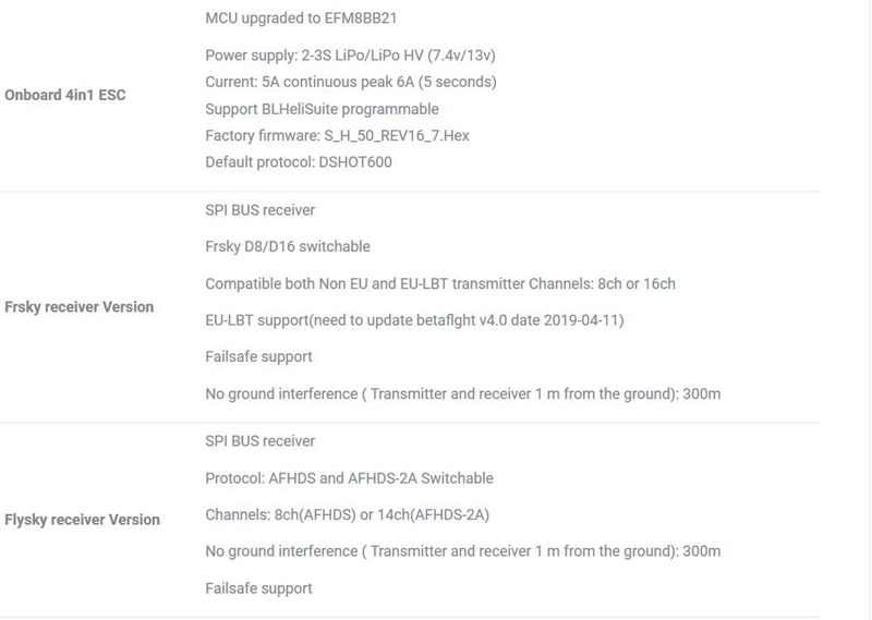 - Frsky version support both NON-EU and EU-LBT Frsky transmitter(EU-LBT need to update firmware to Betaflight 4.0( release date :2019-4-11)