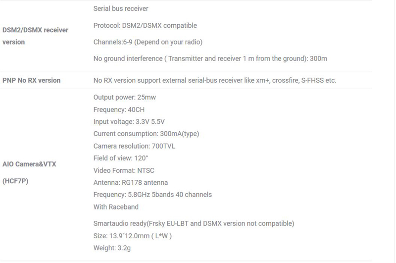 - Betaflight OSD support ,easy to get RSSI, Voltage ,current from your goggles(DSMX version no RSSI output)