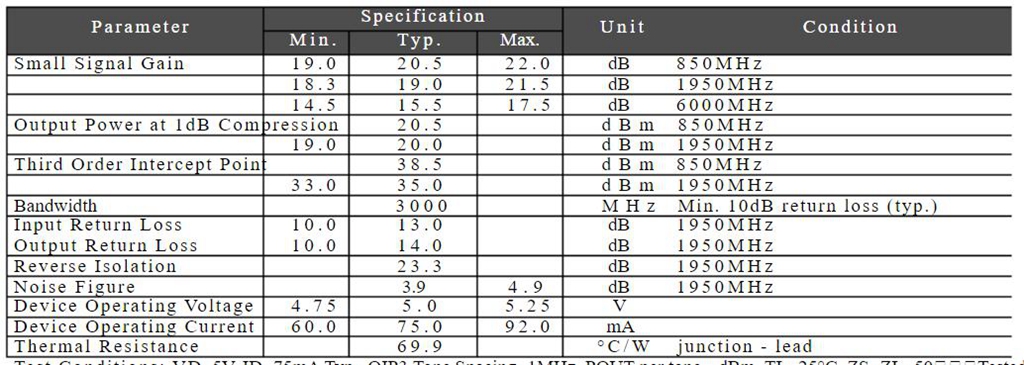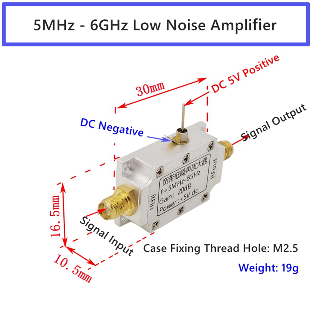 - The amplifier operates in a frequency range of 5-6000MHz and has a power gain of 20dB. It has the advantages of wide frequency range, stable gain, low noise figure, and large dynamic range, making it suitable for fixed gain amplification of various RF signals.
