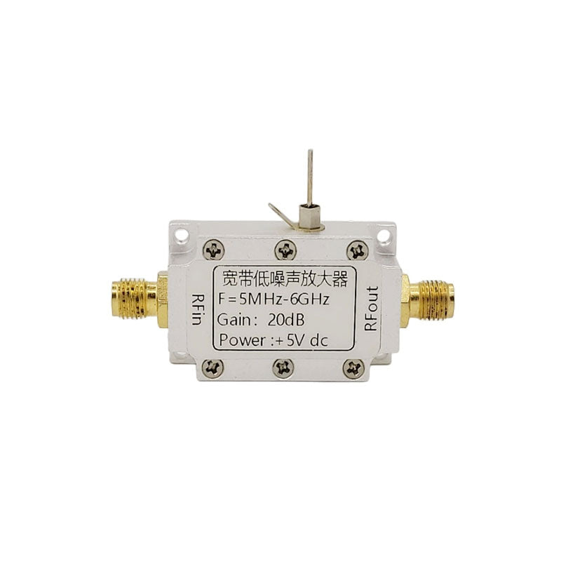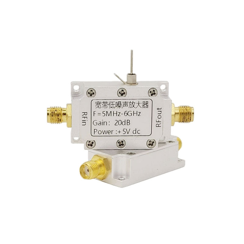 - The amplifier operates in a frequency range of 5-6000MHz and has a power gain of 20dB. It has the advantages of wide frequency range, stable gain, low noise figure, and large dynamic range, making it suitable for fixed gain amplification of various RF signals.