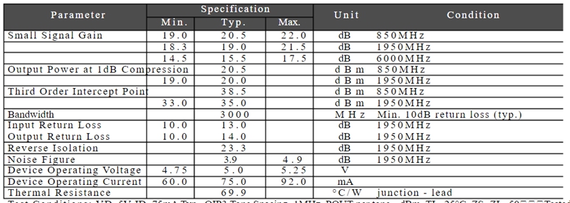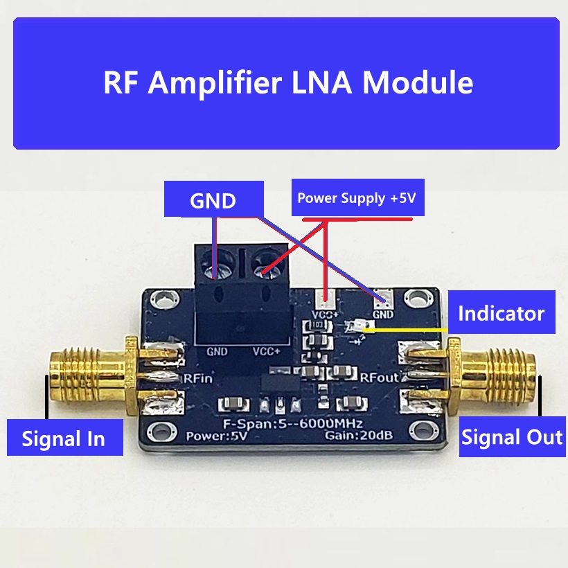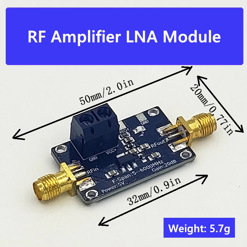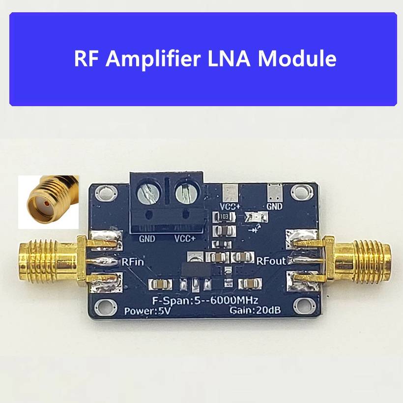 - The amplifier has a working frequency range of 5-6000MHz, a power gain of 20dB, a wide frequency range, stable gain, small noise figure, and a large dynamic range (+20dBm at 1dBP). It is suitable for fixed gain amplification of various RF signals