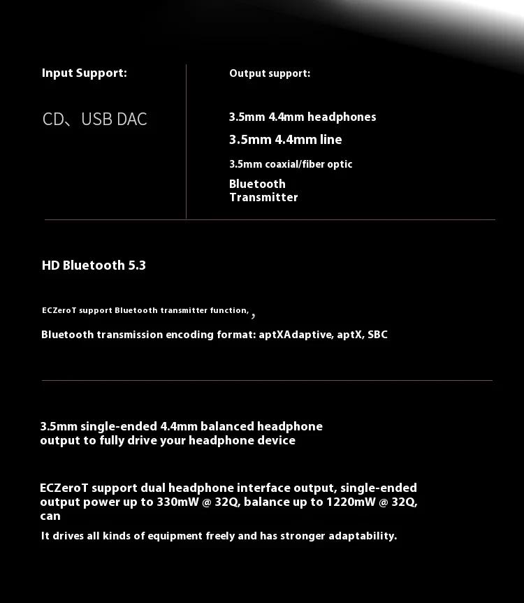- Bluetooth V5.3 output supporting aptX Adaptive, aptX and SBC.