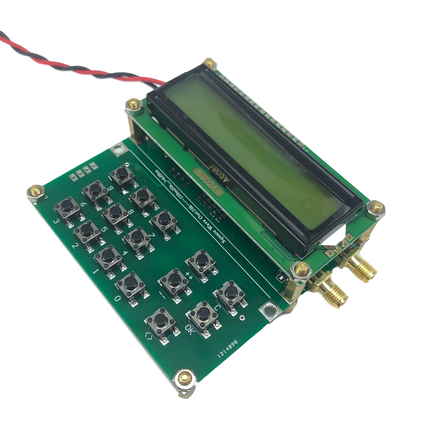 Operating keyboard is composed of 15 ppt buttons. There are 10 digital keys from 0 to 9, and "++" and "--" keys are used to adjust frequency, and also generate transmit output behavior. Short press the "++" or "--" button, step will increase or decrease by 1khz when original frequency is output. When you press and hold "++" or "--" button for more than 1 second, a continuous up or down scan mode will appear. To end the scan, just press the "++" "--" button or "ok" button. The "ok" button is the output control key, press it once to transmit, and press it again to stop transmitting. To end the transmitting caused by "++" or "--", you need to press "OK" twice. When it is outputting, ">>" will appear in the upper right corner of the display. The "C" button functions to end the transmission and return the frequency to zero.