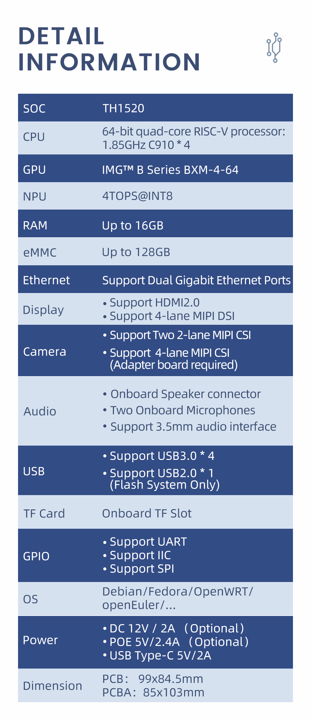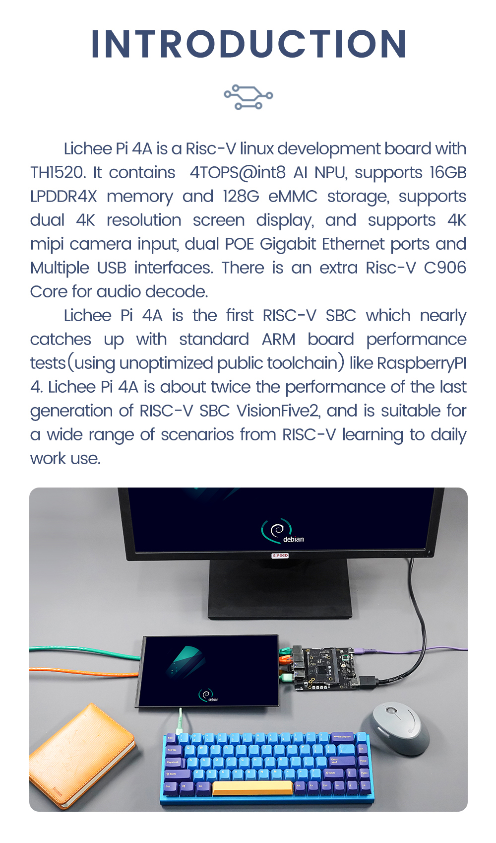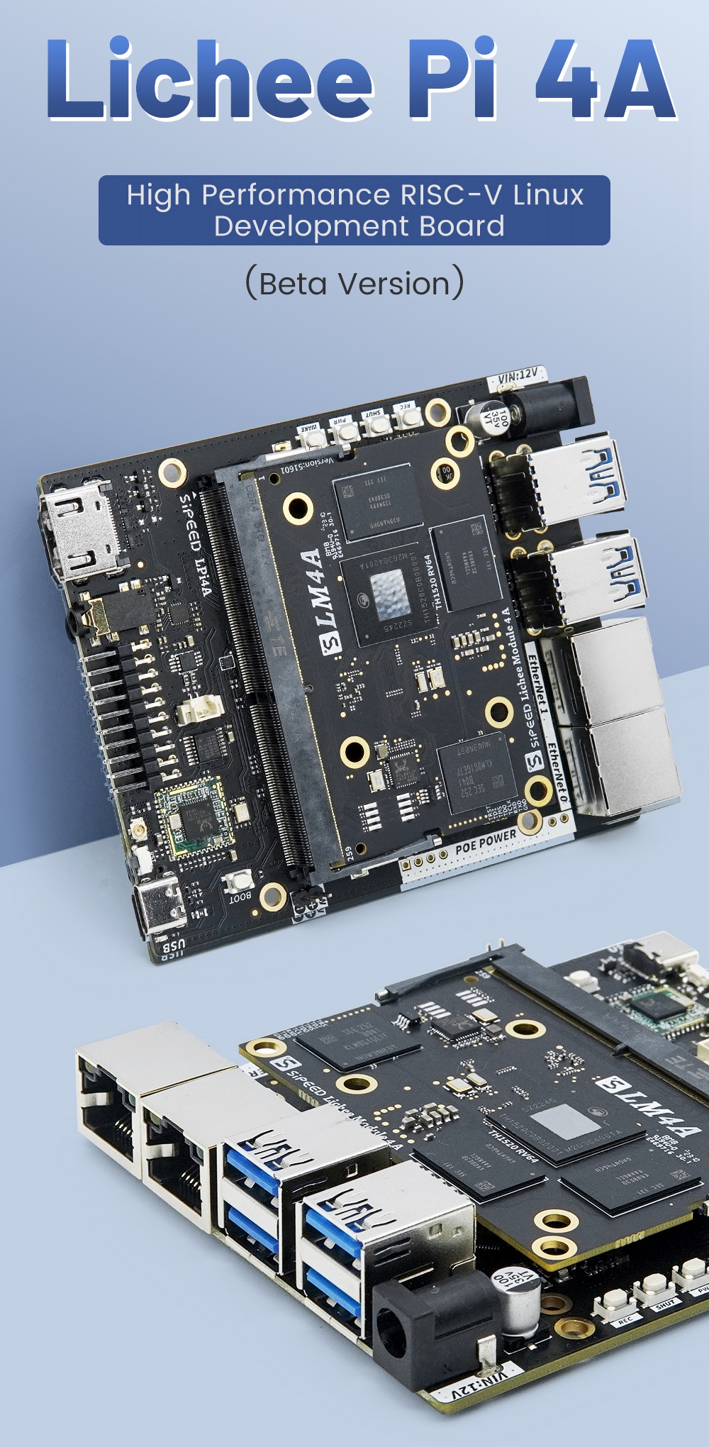 - Lichee Pi 4A is a Risc-V linux development board with TH1520. It contains 4TOPS for int8 Al NPU, supports 16GB LPDDR4X memory and 128G EMMC storage, supports dual 4K resolution screen display, and supports 4K mipi camera input, dual POE Gigabit Ethernet ports and multiple USB interfaces. There is an extra Risc-V C906 Core for audio decode.