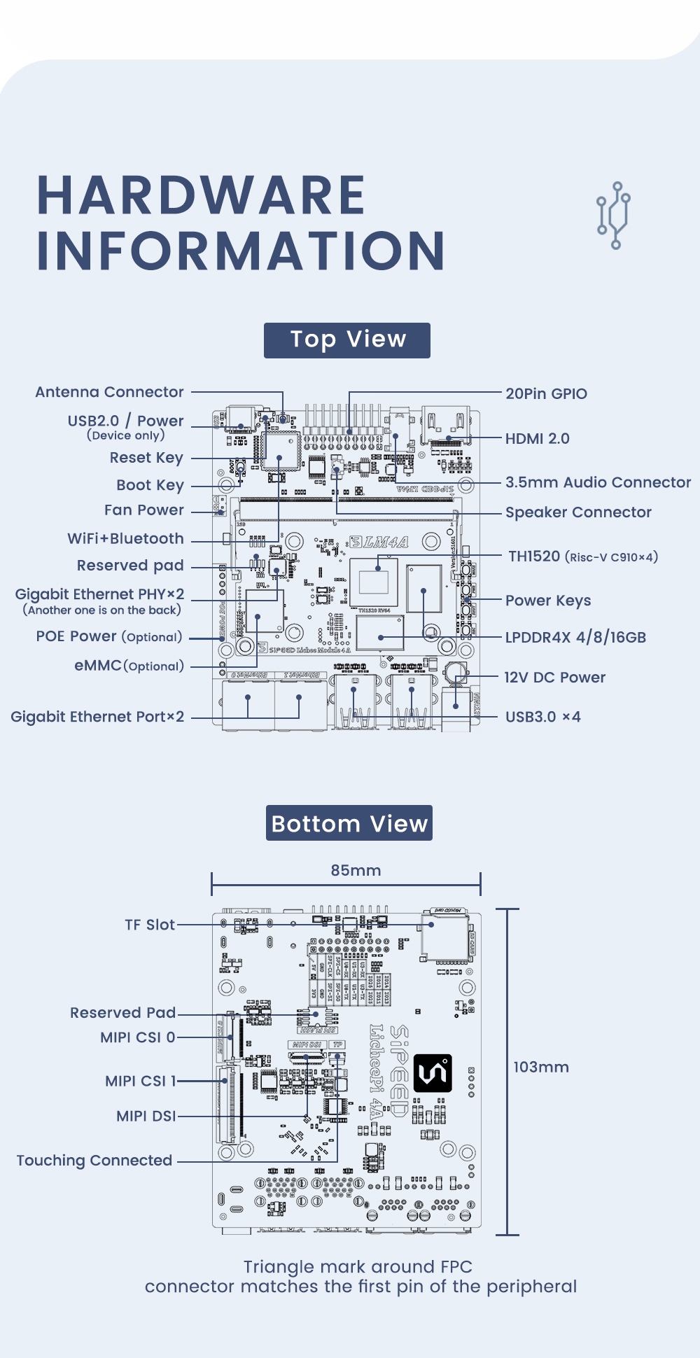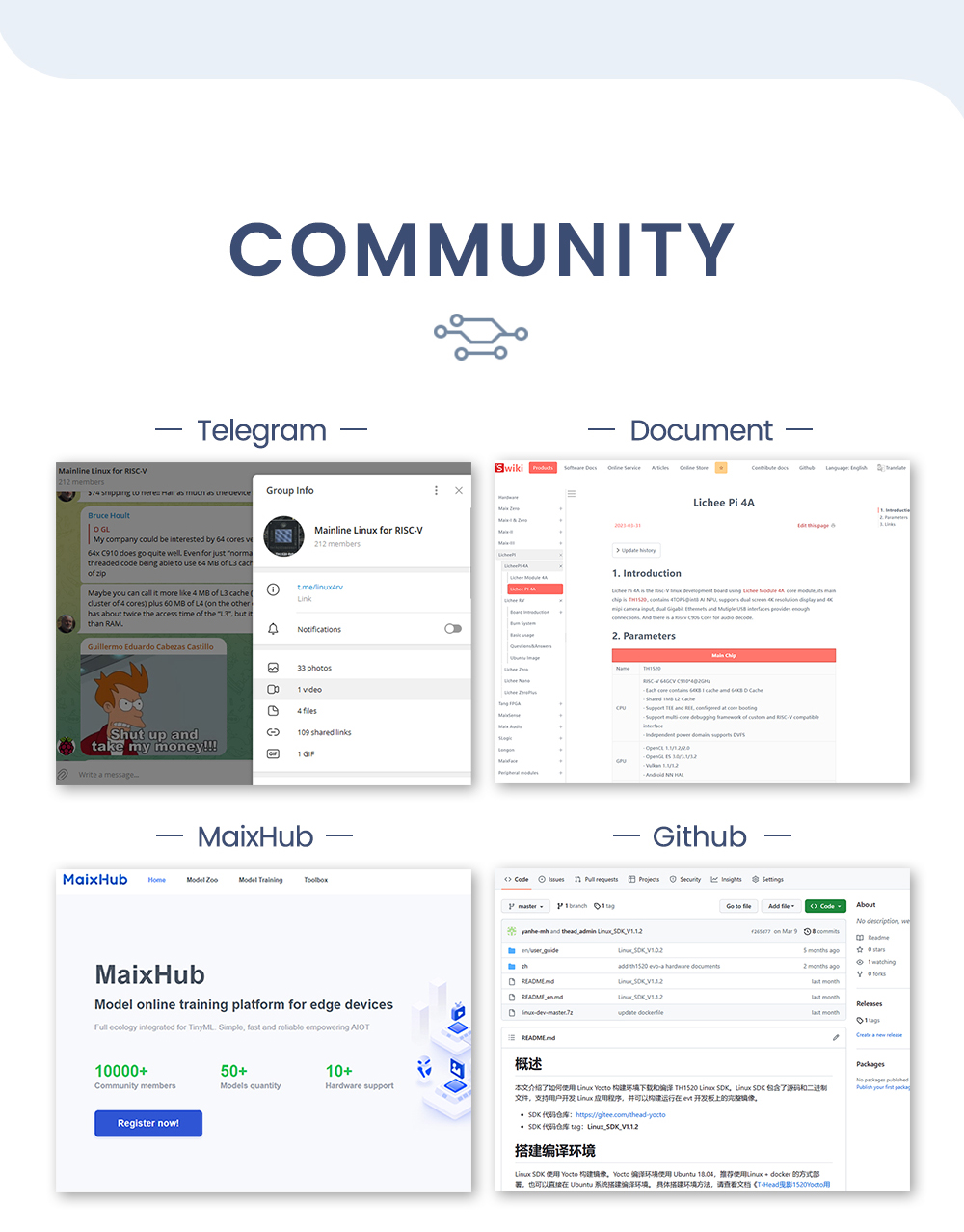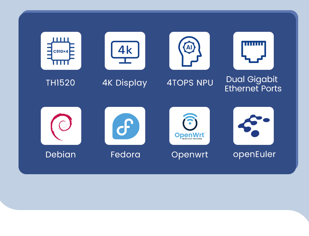 - Lichee Pi 4A is a Risc-V linux development board with TH1520. It contains 4TOPS for int8 Al NPU, supports 16GB LPDDR4X memory and 128G EMMC storage, supports dual 4K resolution screen display, and supports 4K mipi camera input, dual POE Gigabit Ethernet ports and multiple USB interfaces. There is an extra Risc-V C906 Core for audio decode.
