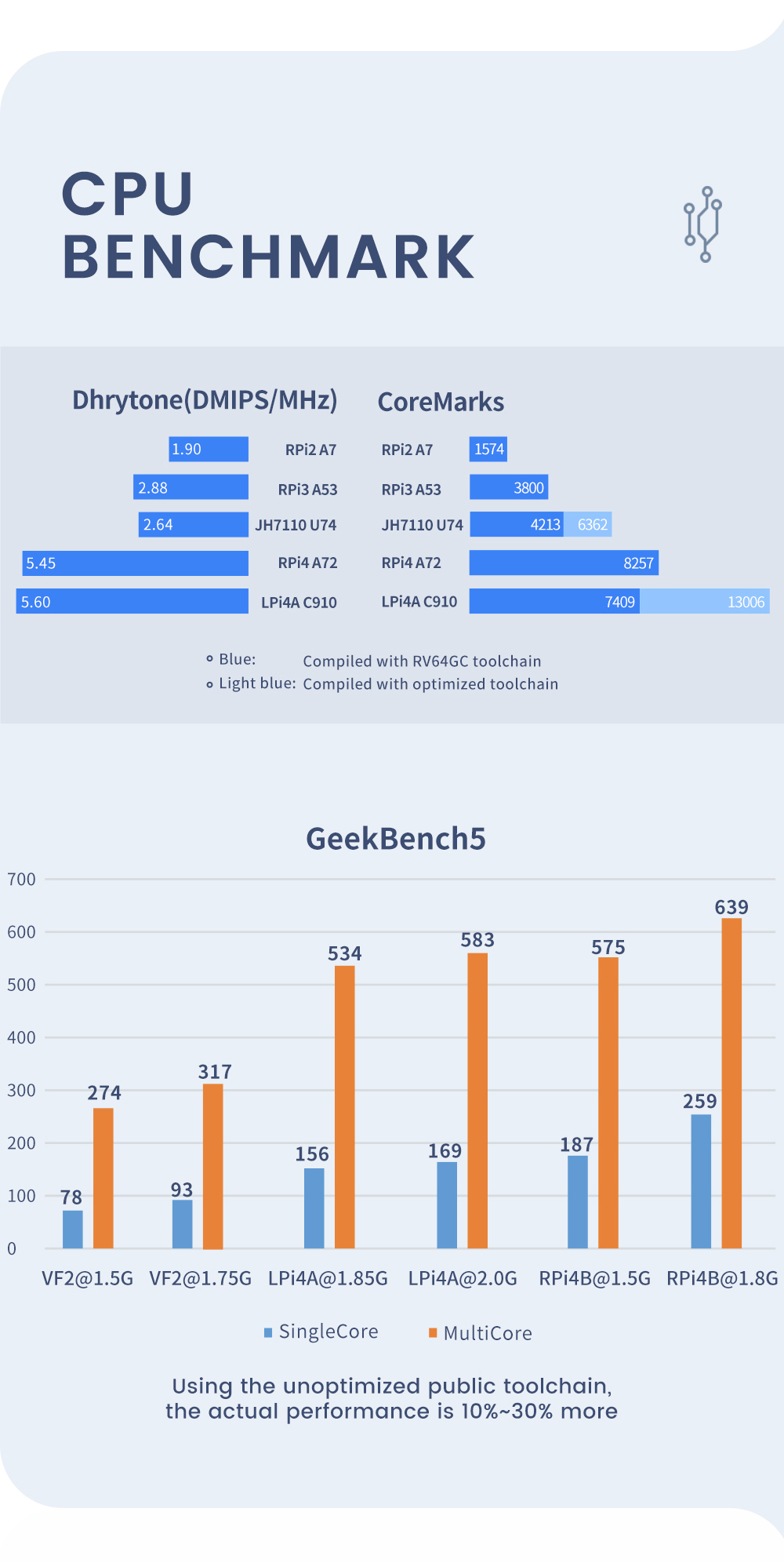 - Lichee Pi 4A is the first RISC-V SBC which nearly catches up with standard ARM board performance tests (using unoptimized public toolchain) for Raspberry Pi 4. Lichee Pi 4A is about twice the performance of the last generation of RISC -V SBC VisionFive2, and is suitable for a wide range of scenarios from RISC-V learning to daily work use.