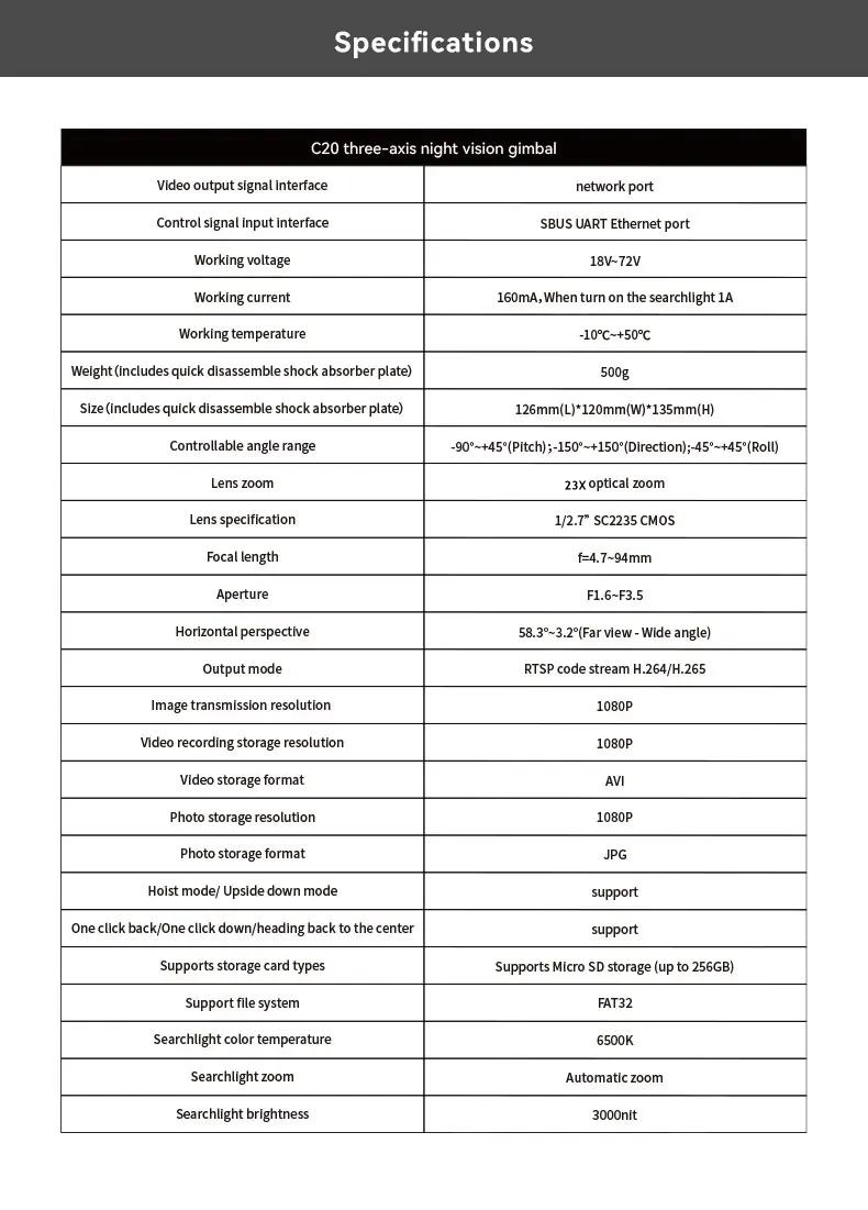 - Controllable angle range: -90°~+45°(Pitch); -150°~+150°(Directlon); -45°~+45°(Roll)