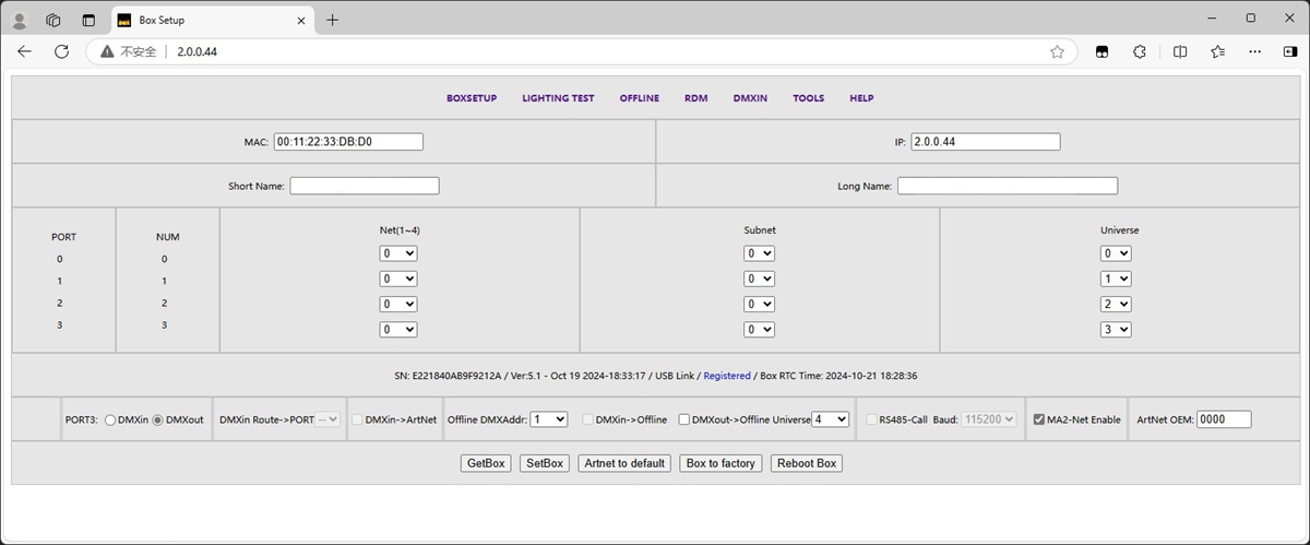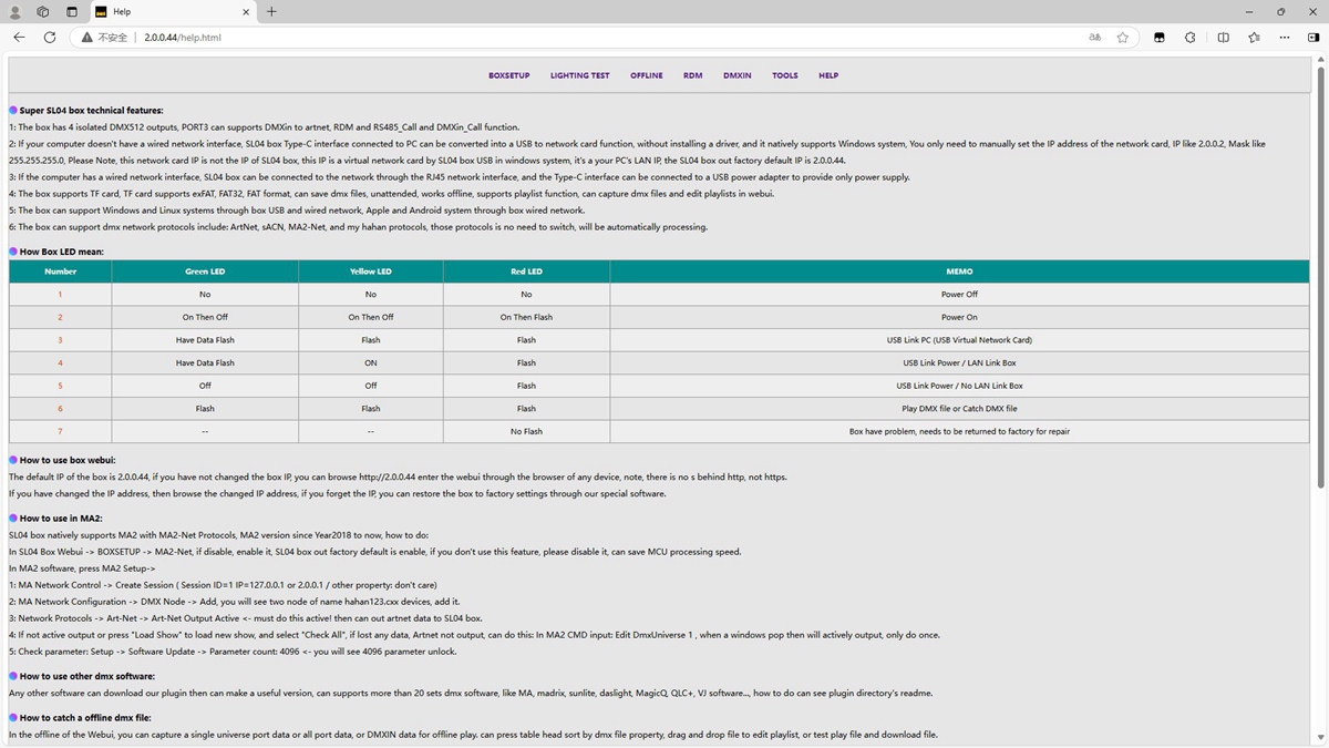 - This box is not an ordinary Artnet network box, it is a very powerful box, the box supports lighting network protocols for Artnet, sACN, hahan, MA2-NET, Native support for MA2 software, no need to crack, official download MA2 onPC can be used directly (like as the original equipment), support RDM, support offline capture, playback and call, support DMXin, support DMXin->Artnet transfer to 3D or control software, support cloning, interception and route of dmx universe, support DMX512 system detection function (can be used as dmx512 detector), Built-in 54 kinds of RGB, RGBW effects (can be called externally), support for http, UDP, web, DMXin, DMXout, RS485, RS232 call, can meet all the call needs of the centralized control system, note: RS232 call needs to add 1 module for a few dollars for level conversion, important note: RS232 can not be directly connected, RS232 level is +13V/-13V, box interface is 5V level.