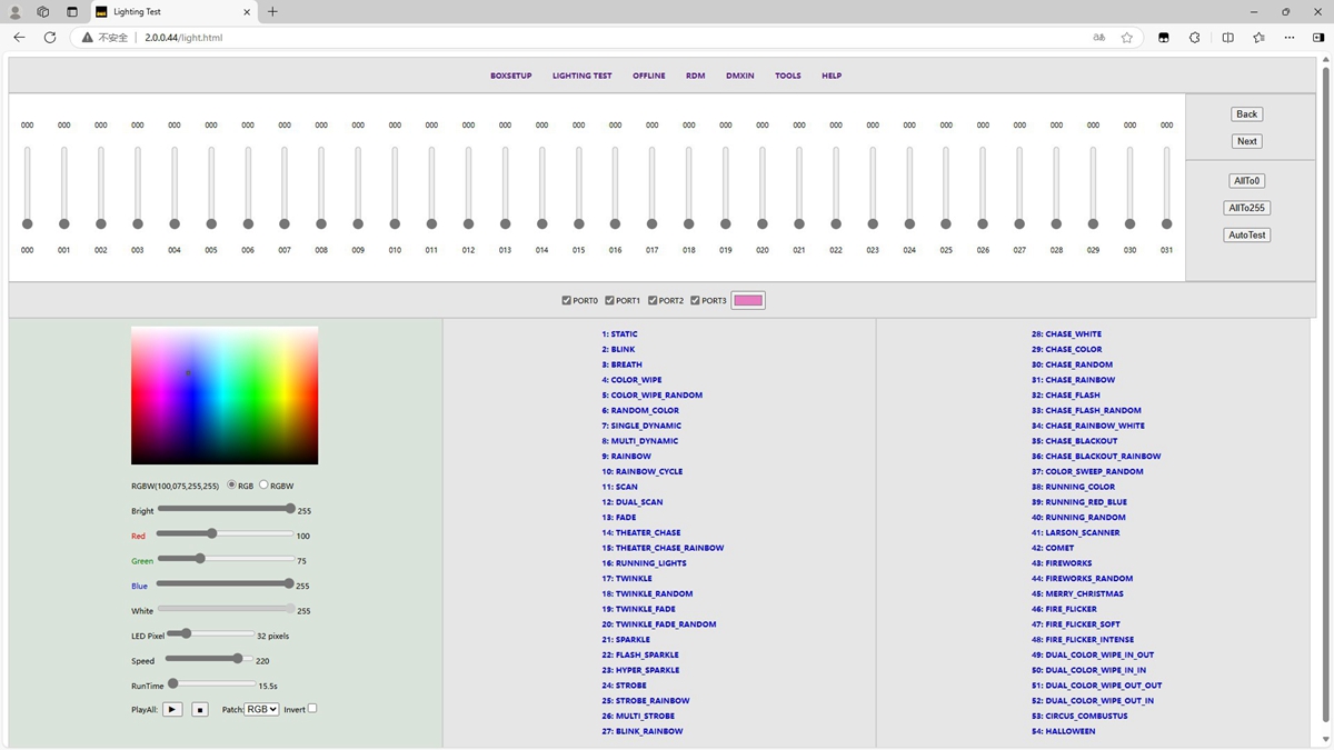 - Built-in 54 kinds of RGB, RGBW effects (can be called externally).