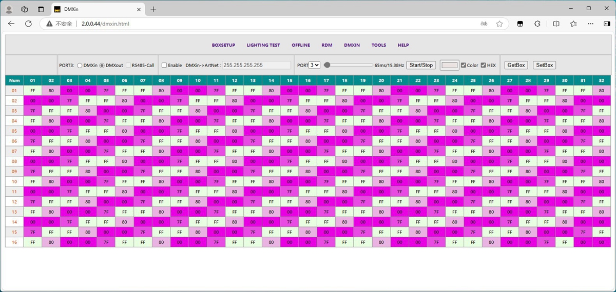 5: DMXin and DMX hook, DMX route function, this function can capture the DMX512 signal of the physical console and the DMX512 data on the network, you can clone the light show of the physical console, you can also hook the physical console through the routing function, each channel displays the changed value in real time through different colors, which can be used as a dmx512 detector.