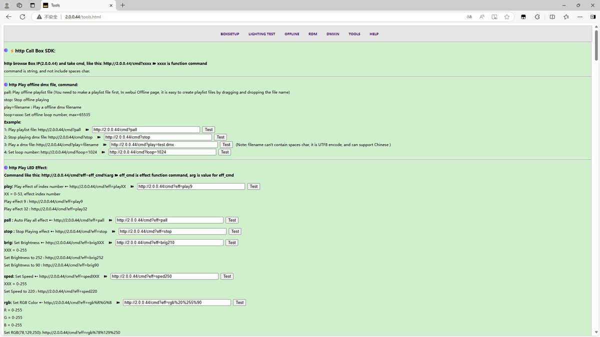 1: Webui box setting function, including: for MAC, IP network settings, Artnet universe and Name settings, Artnet OEM settings (can simulate equipment from other manufacturers), Function module settings and so on.