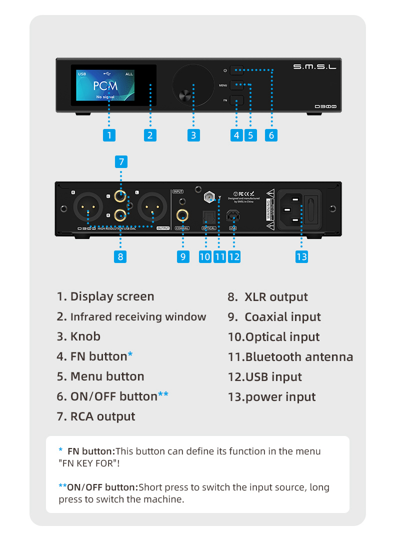 SMSL D300 USB DAC Bluetooth 5.0 DAC High Resolution DSD512 DAC Decoder Lossless Hifi Sound Quality