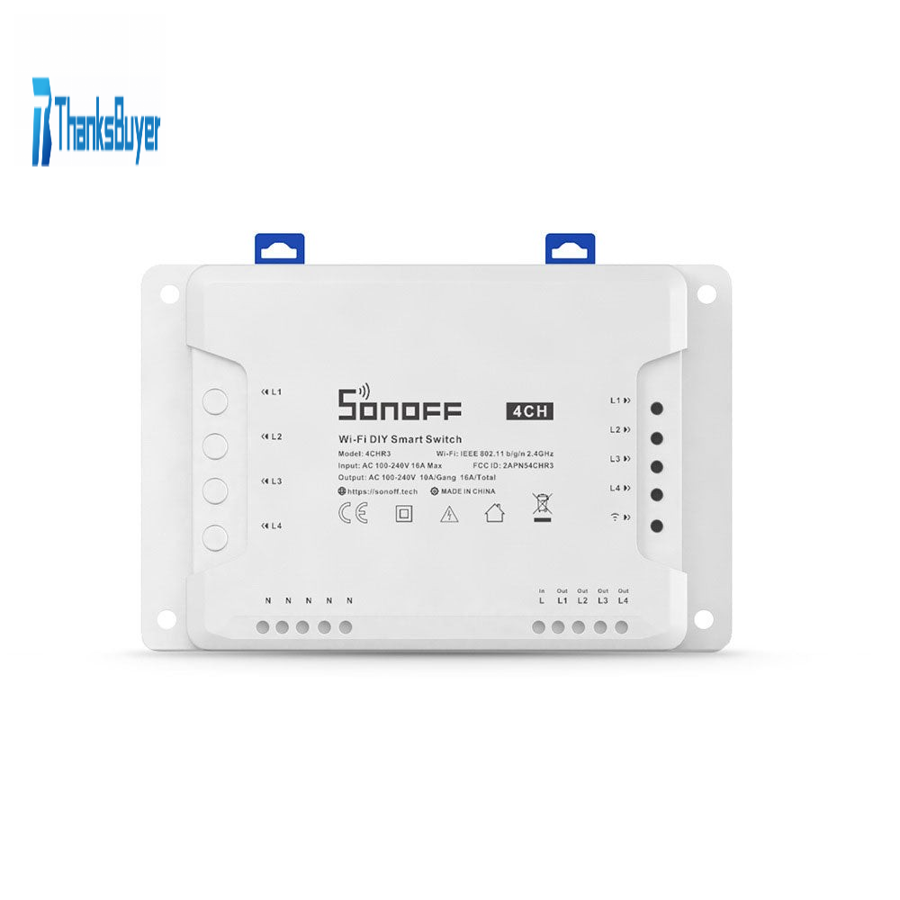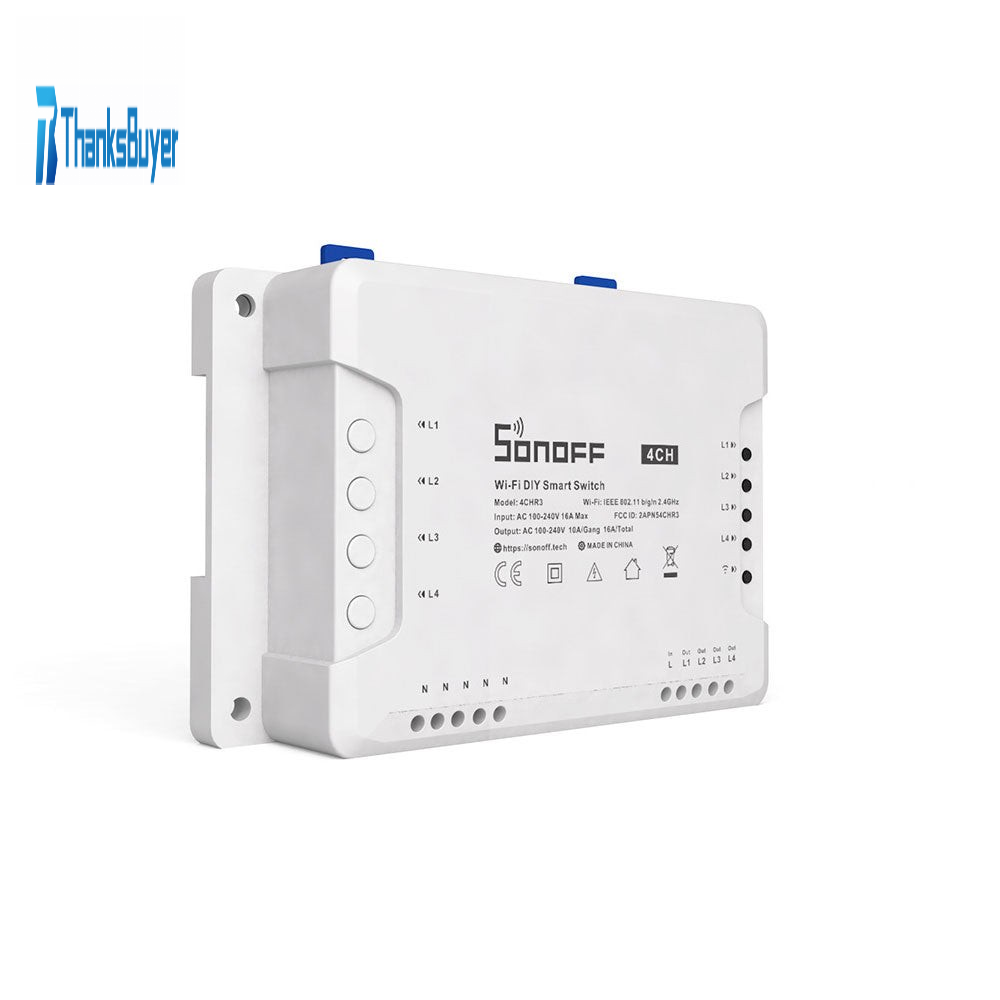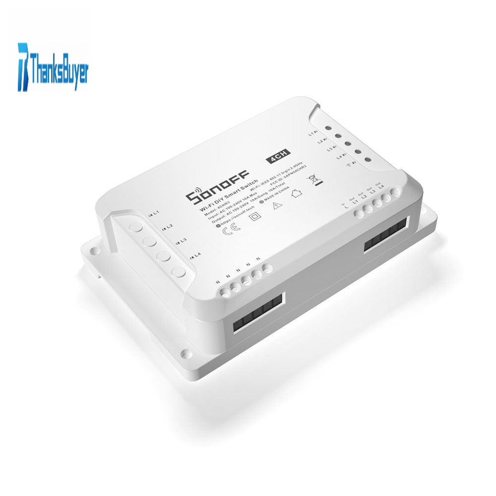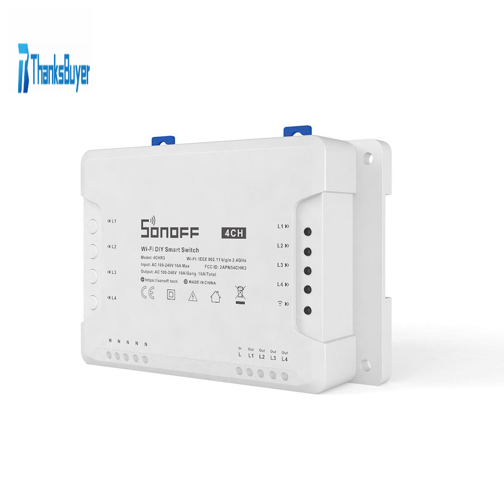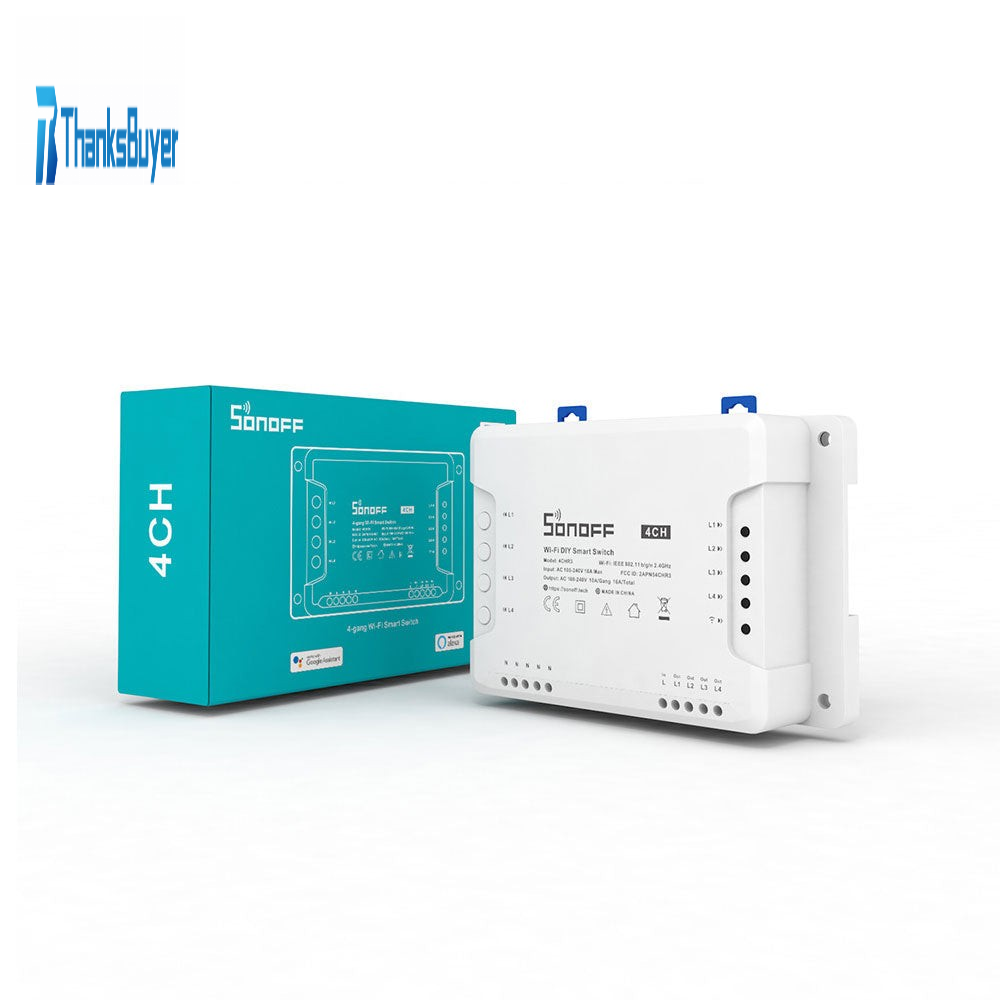 - 100% brand new and high quality Sonoff 4CH is an ESP8285 based 4 channel (4-gang) din rail mounting WiFi switch. Sonoff 4CH supports to connect and control 4 home appliances, which can be turned on/off separately by the buttons or iOS and Android APP EweLink. Owning a Sonoff 4CH means you have 4 Sonoff basic WiFi switches integrate together. The enclosure is din rail mount supported! A DIN rail is a metal rail of a standard type widely used for mounting circuit breakers and industrial control equipment inside equipment racks. These products are typically made from cold rolled carbon steel sheet with a zinc-plated or chromated bright surface finish. Sonoff 4CH belongs to Sonoff family, definitely, it bears all the functions basic Sonoff has. In EweLink, you can remote turn on/off from anywhere at any time, set single/repeat/countdown timing schedules to turn on/off at a specified time, share to others so that they can control together. Sonoff 4CH is hacker-friendly that you can flash your firmware without difficulty. After accessing to Google Nest, e-We Link can receive real-time environment data like temperature, humidity from Google Nest, as well as checking if there is anybody home or not. All these can be used to create smart scene to control e-WeLink supported Sonoff devices.