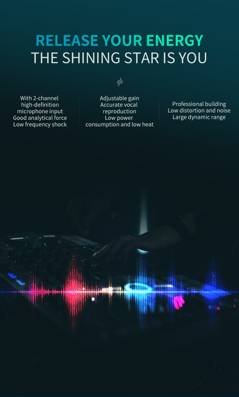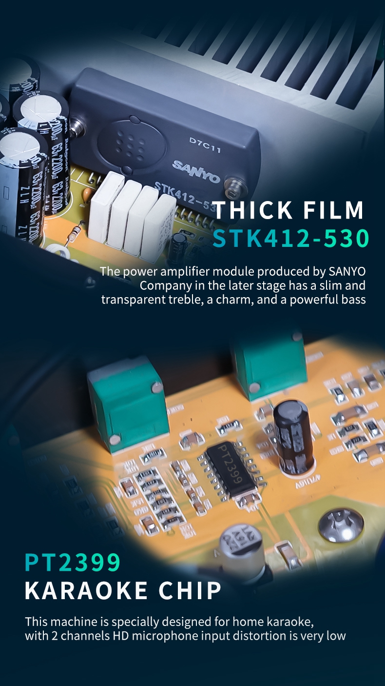 - PT2399 karaoke chip, with 2 channels of high-definition microphone input, with very low distortion.