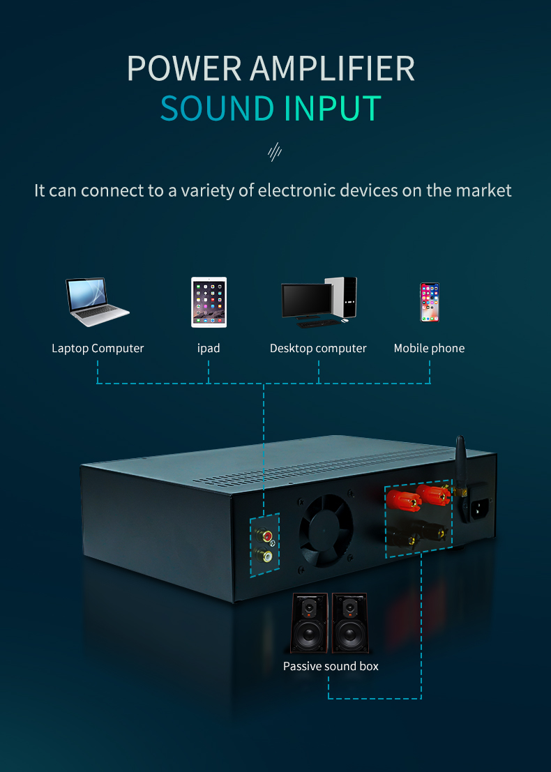- It can connect multiple electronic devices, mobile phones, desktop computers, Ipads, laptops, and support passive speaker output.