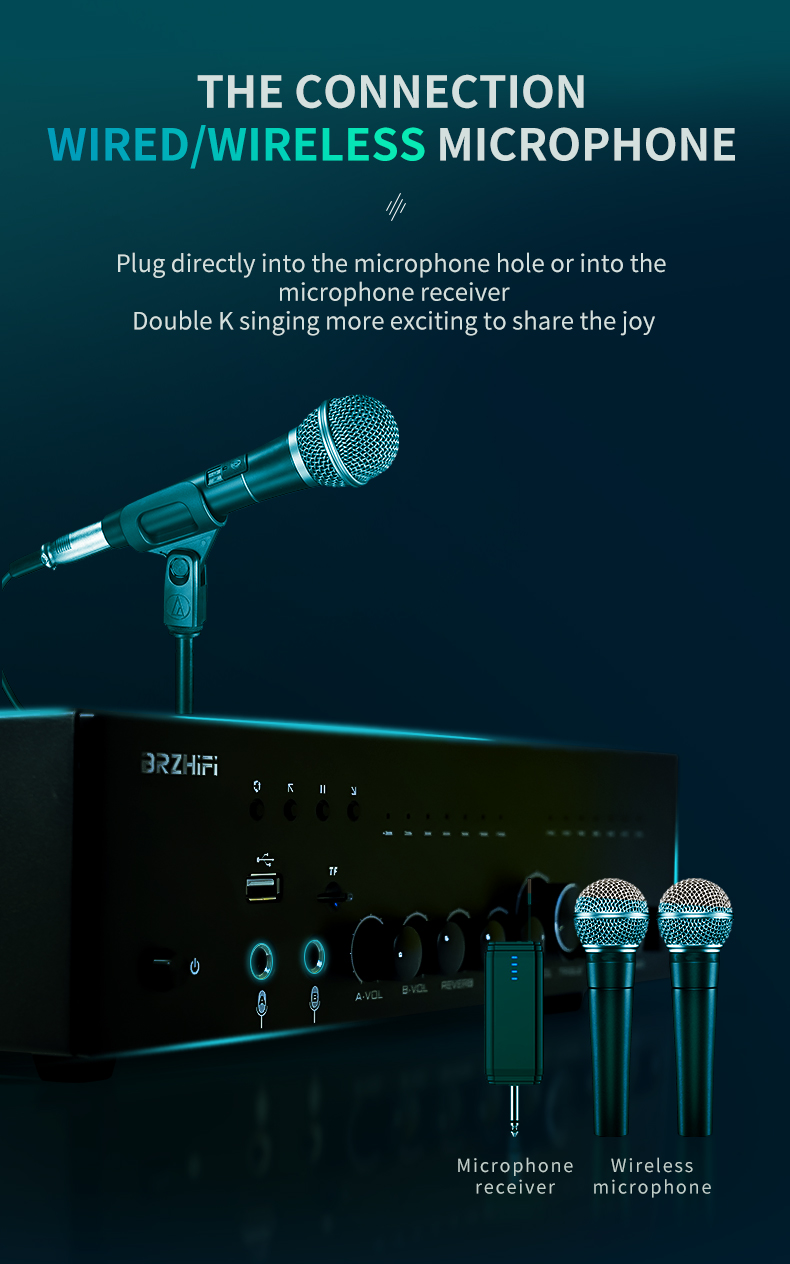 - This amplifier supports wired/wireless microphones, which can be plugged directly into the microphone hole or into the microphone receiver.