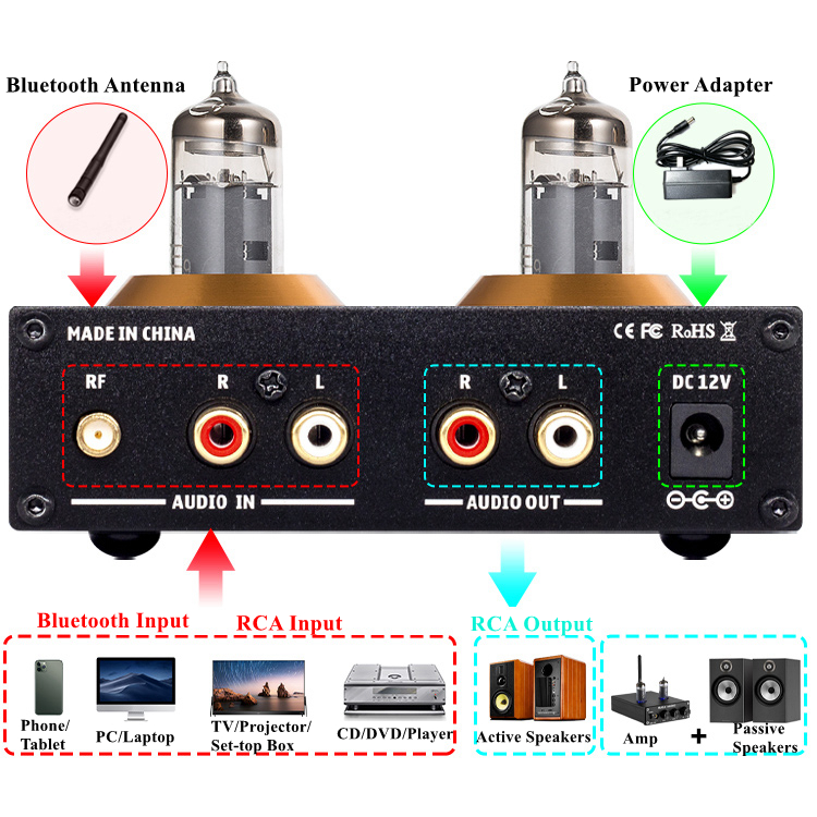 - It is a tube preamplifier. It needs to be used with a power amplifier or active speakers. It cannot be directly connected to passive speakers.
