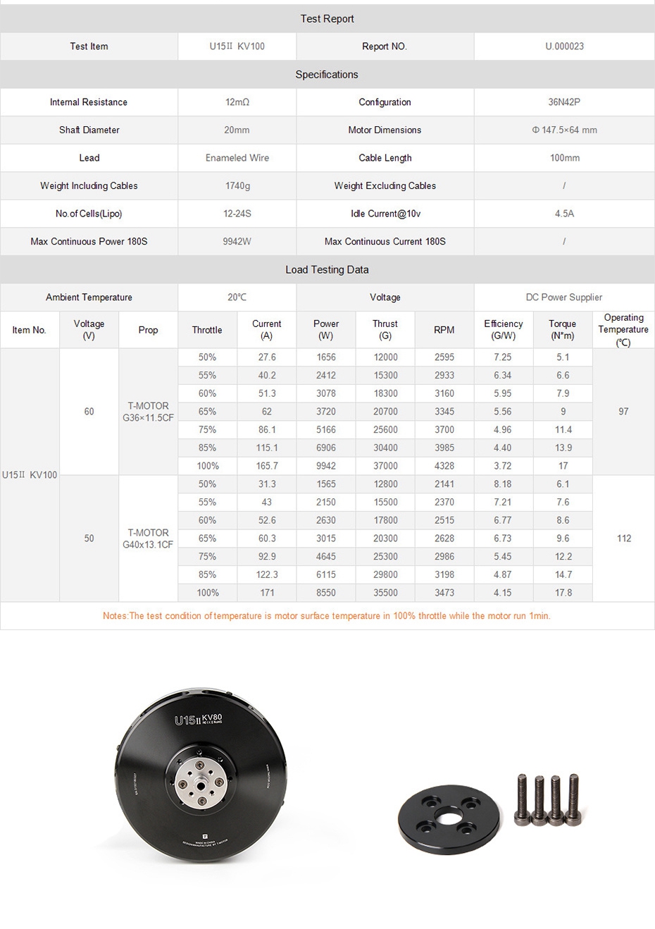 T-Motor U15II KV100 36KG Thrust Drone Motor High Efficiency N42 UH Magnet for UAV Emergency Rescue Freight