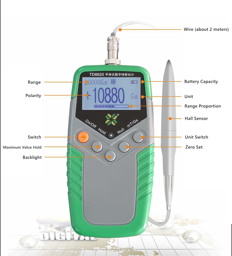 - The TD8620 is used for measuring magnetic flux density, range: 0 ~ 2400mT, users can switch the units G or mT by one key. Three accuracy classes are optional: class 1, class 2, and class 5. It also has the functions of auto-zero, auto-range, maximum maintain, backlight, battery display, etc.