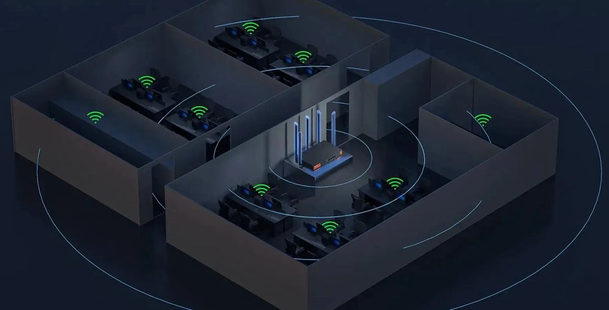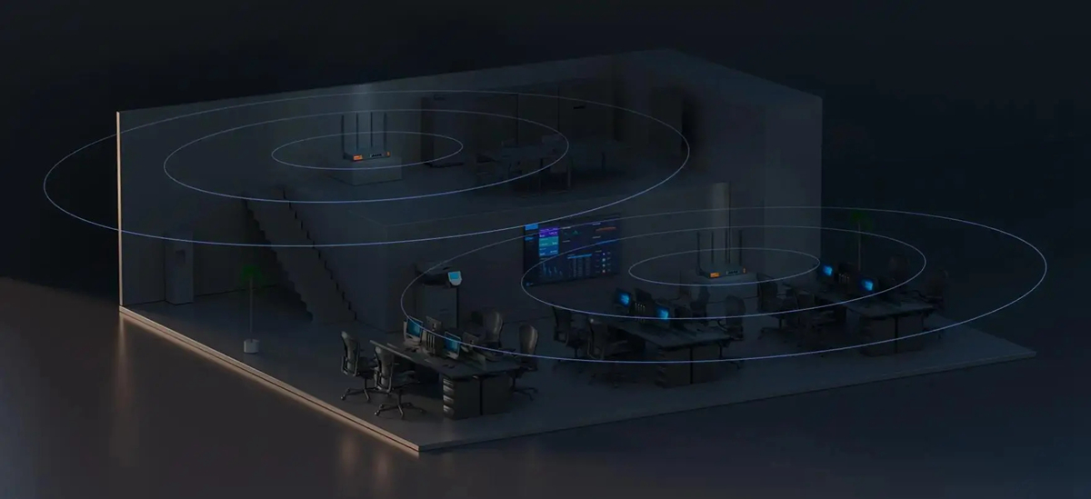 5 high gain antennas for wider coverage. Good WiFi even in the corner of the office. Designed with 5 high-gain omni-directional antennas and equipped with independent signal amplifiers, which significantly improve signal strength and sensitivity. W30E can easily penetrate three walls to achieve full coverage of 500㎡. The WiFi signal starts from the centre of the office and reaches every corner, regardless of the size of the household.