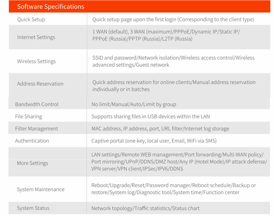 With new generation of high-performance chipset for Broadcom. Fast and efficient office networking. Adopting the new generation of American quad-core processor for Broadcom with a frequency of up to 1.7GHz and equipped with 256MB of large memory, the machine delivers industry-leading high performance and high stability, supporting long hours of uninterrupted work and meeting the needs of SMEs for high-speed/stable/reliable/secure Internet access.