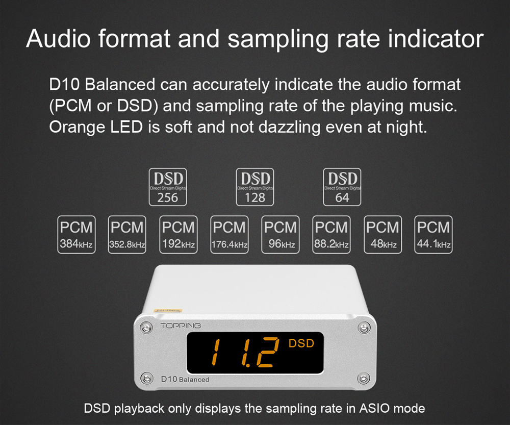 - Audio format and sampling rate indicator. D10 Balanced can accurately indicate the audio format (PCM or DSD) and sampling rate of the playing music. Orange LED is soft and not dazzling even at night