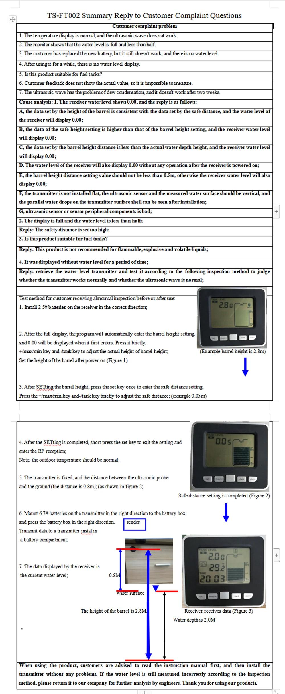 - Transmitter water tank temperature measuring range: -40℃ ~ 60℃/ -40℉ ~ 140℉