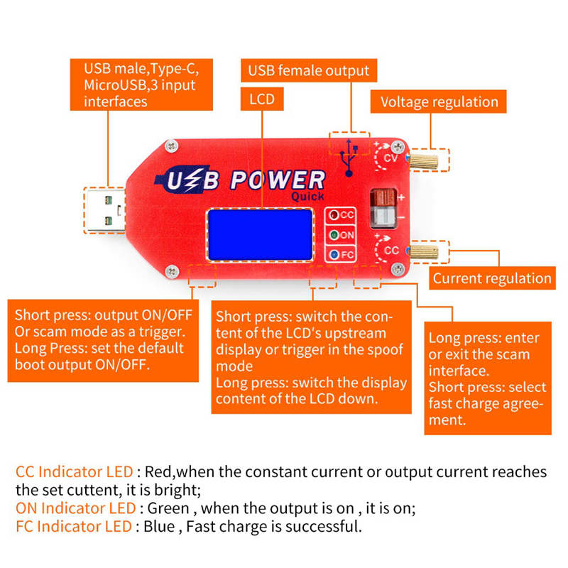 Short press the button to switch displaying input voltage and output voltage. In fast charge protocol selection mode, fast charge is triggered. Long press the button to switch displaying output current, output power, and capacity statistics.