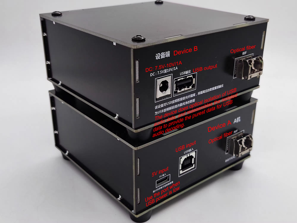 The USB data isolator processors adopt optical fiber transmission isolation. One set includes device A and device B. These two devices are connected using professional LC glass optical fibers. Data packet is transmitted in the optical fibers by professional transceiver after series-parallel processing, without delay. Attention: the isolators do not use traditional SPDIF optical scheme, they belong to pure data transmission, specifically for USB data, so they cannot dock the ordinary optical fiber port of decoders.