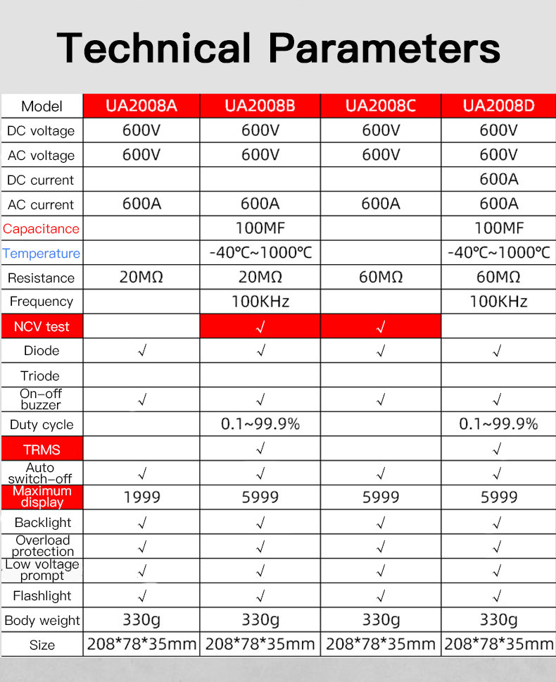 UYIGAO UA2008A AC Clamp Meter Digital Clamp Multimeter Handheld Ammeter Fits Electricians