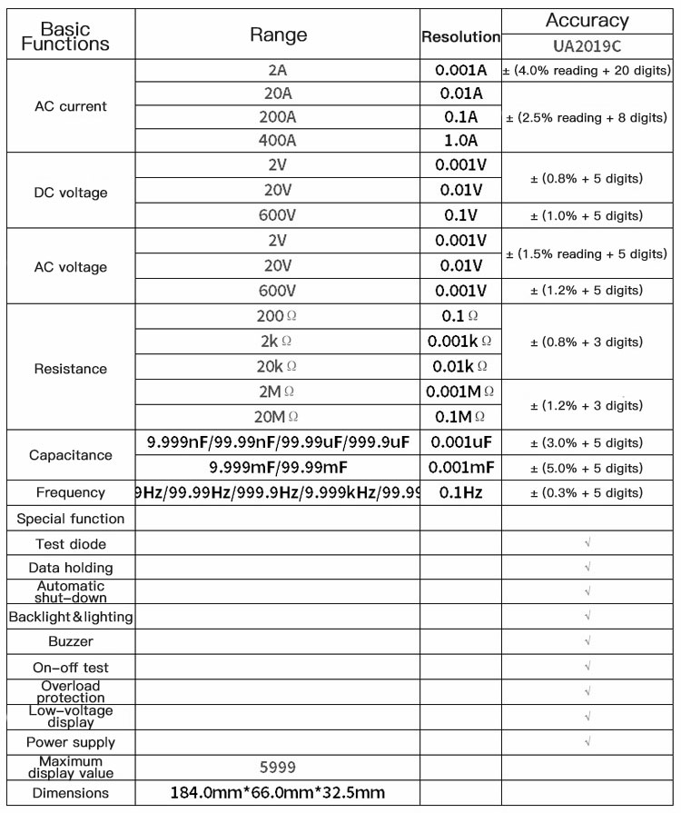 - DC voltage, AC voltage, AC current, resistance test, data holding, frequency measurement, NCV test, output impedance, on-off buzzer, LCD backlight