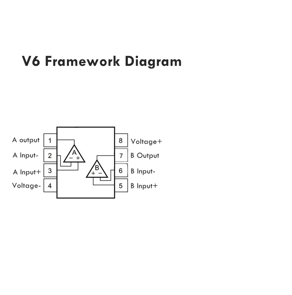 - The V6 dual operational amplifier is suitable for HiFi enthusiasts to improve sound quality in one step. It can be upgraded as a replacement for V5, V4, AMP9922AT, AMP9920AT, MUSES02, MUSES01, AD827, SS3602, OPA2604, NE5532, LME49720, etc.