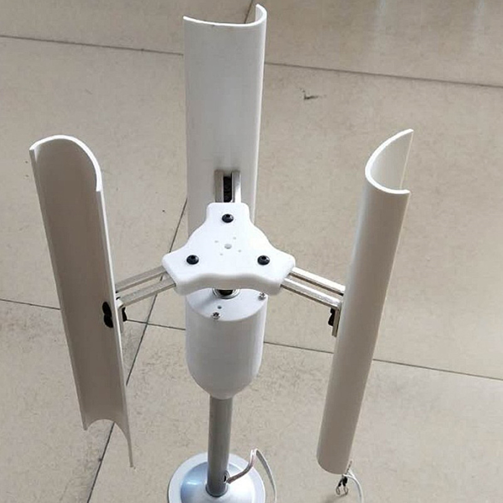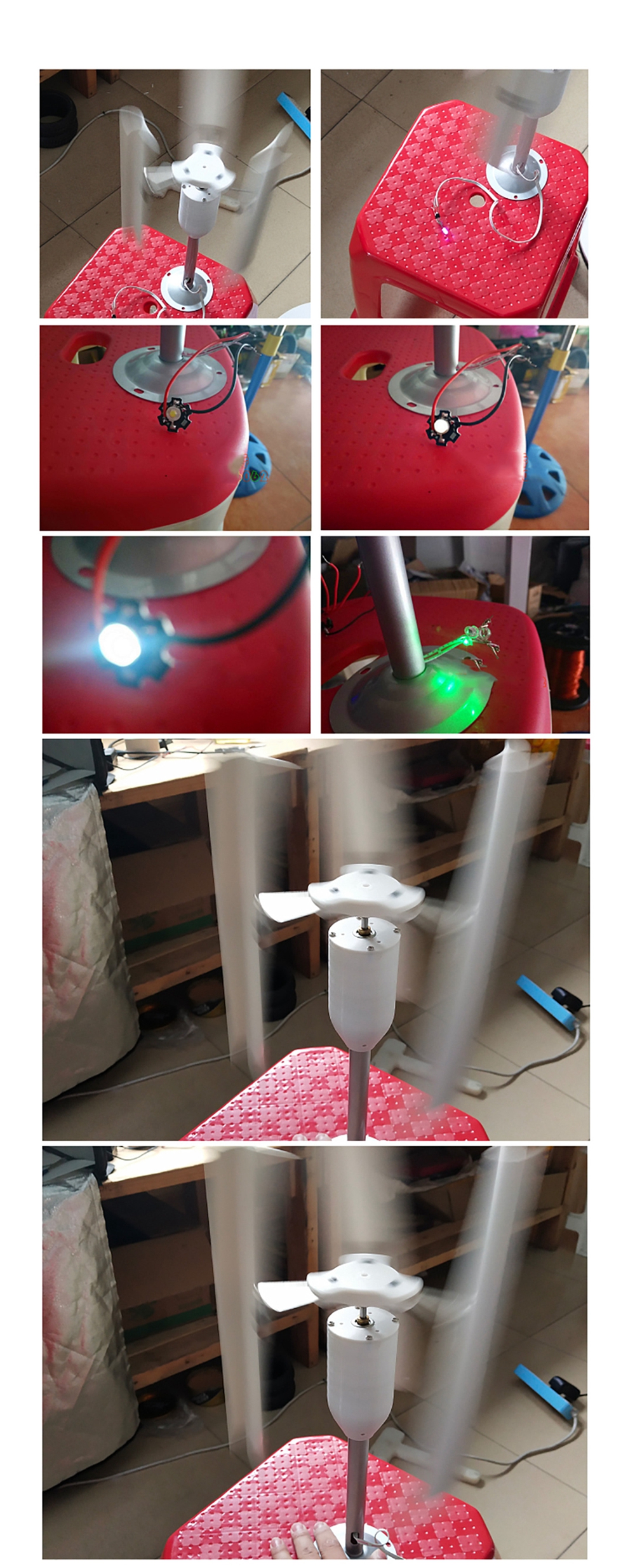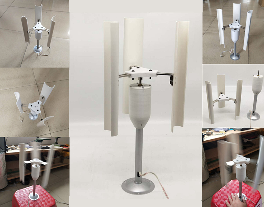 The vertical wind generator adopts a three-phase permanent magnet synchronous generator, without carbon brush, and sends out three-phase alternating current. The bottom outgoing line is three-wire, and the LED can be lit by gently pushing its wind blades. If it needs to be converted into direct current, you can use 6 rectifier diodes and a filter capacitor. The bottom aluminum alloy bracket with screw holes makes it convenient to install and fix. The blade beam adopts hardware stamping to ensure its strength. The blade adopts PVC popular design, with high conversion efficiency, corrosion resistance and UV resistance. Generator shaft is fixed with flange, to ensure accuracy and level. The rest of the parts is manufactured by 3D printing technology.