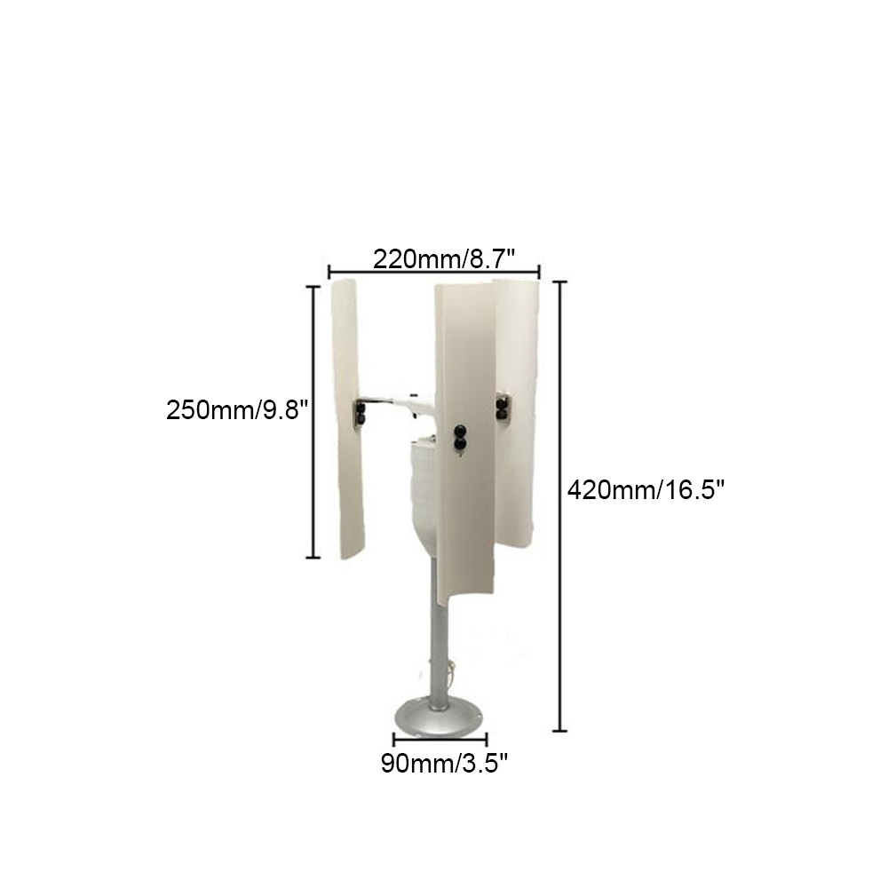 The wind turbine can be used for interior decoration, scientific experiment and model making. The height of the whole generator is 420mm/16.5", the distance from the edge of the fan blade to the axis is 105mm/4.1", the rotating diameter is 220mm/8.7", and the length of the blade is 250mm/9.8".