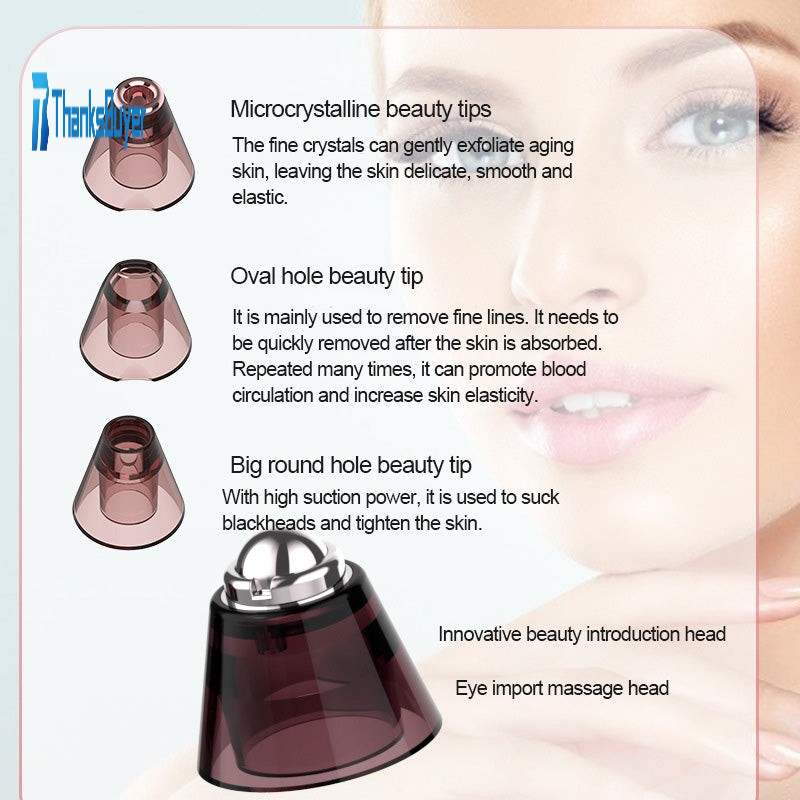 - Four replaceable suction heads can easily solve different blackheads. Microcrystalline beauty head: The fine microcrystalline can gently exfoliate the aging skin, leaving the skin delicate and smooth. Elliptical hole beauty suction head: mainly used to remove fine lines, it needs to be pulled out quickly after the skin is sucked. Repeated use can promote skin blood circulation and increase skin elasticity. Big round hole beauty suction head: large suction power, used to suck blackheads and tighten V face. Innovative beauty import head: leading to the eye massage head.
