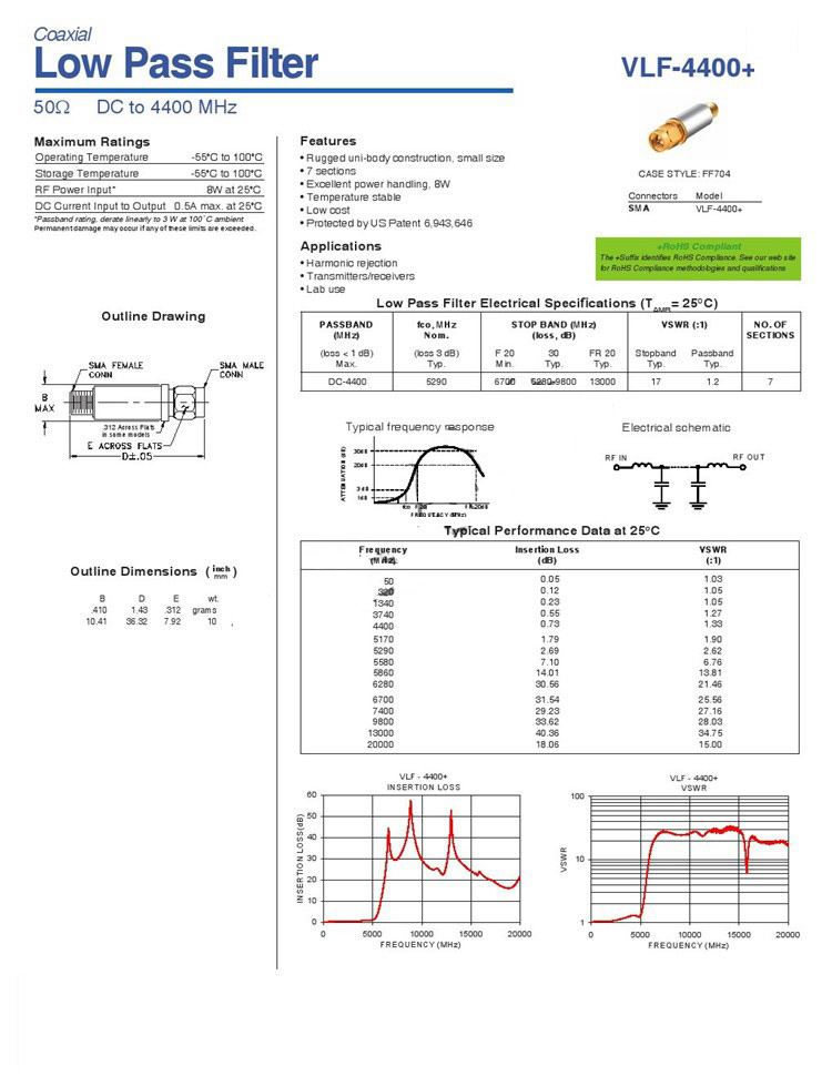 VLF-4400+ RF Low Pass Filter 50ohm DC to 4400MHz High Performance RF Filter for Mini-Circuits