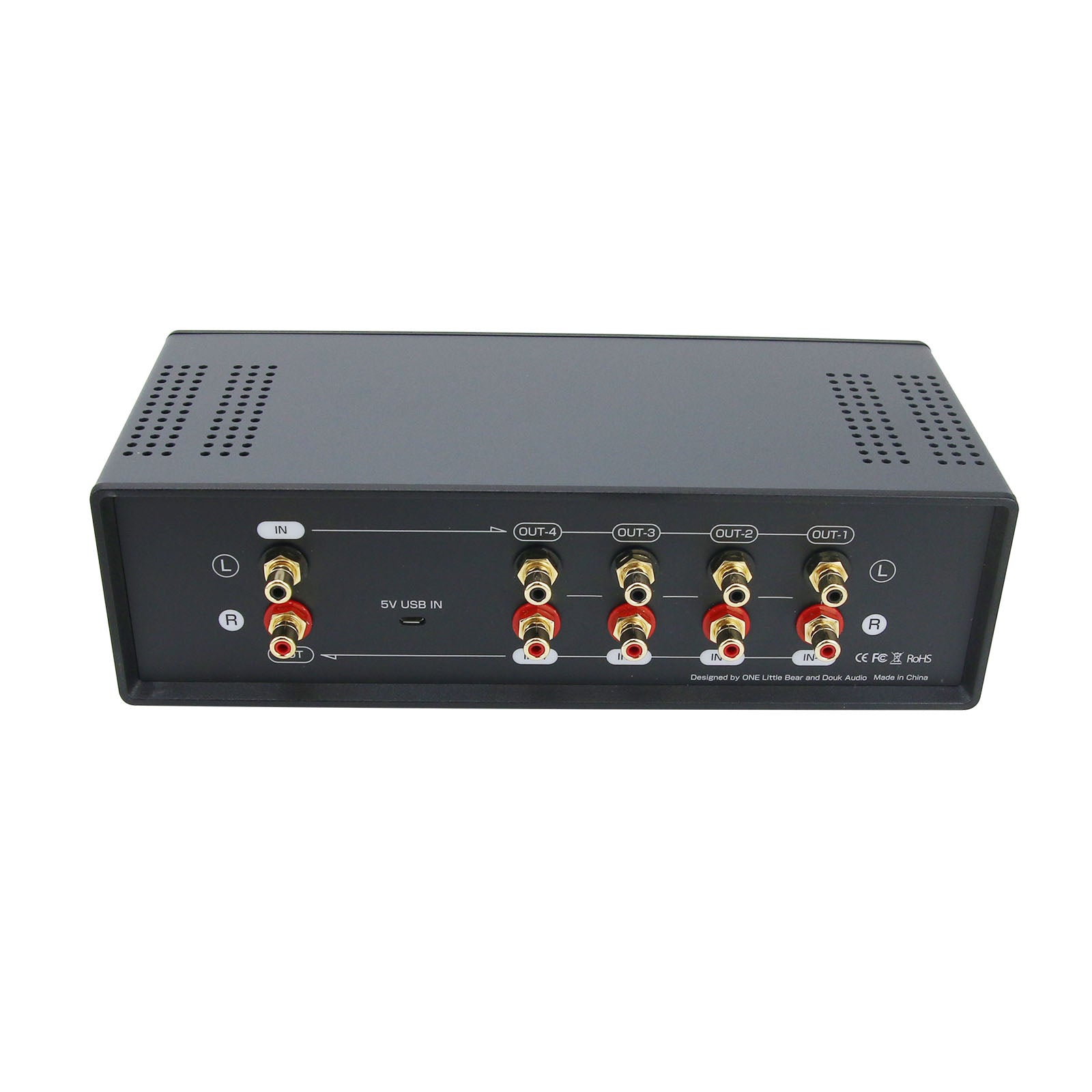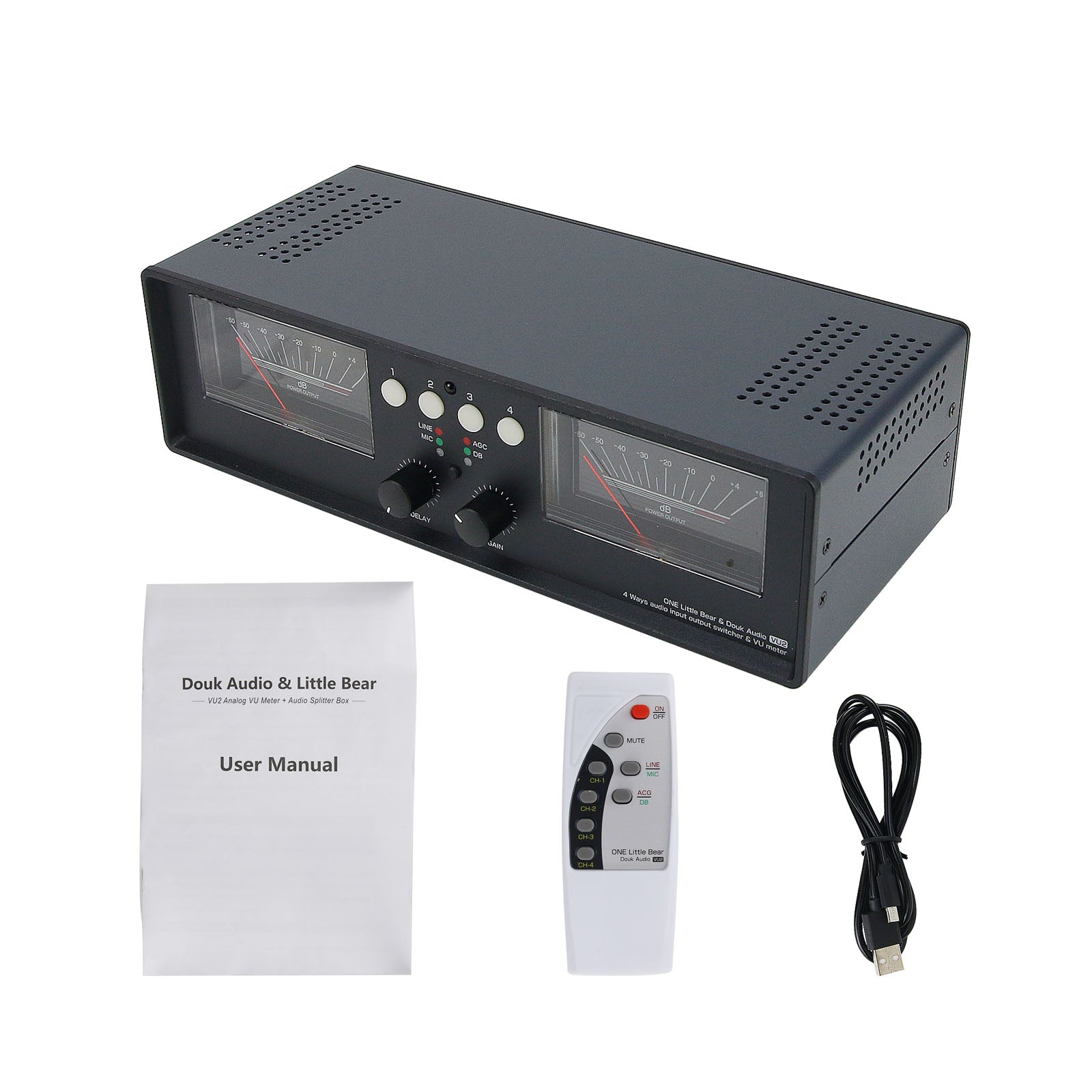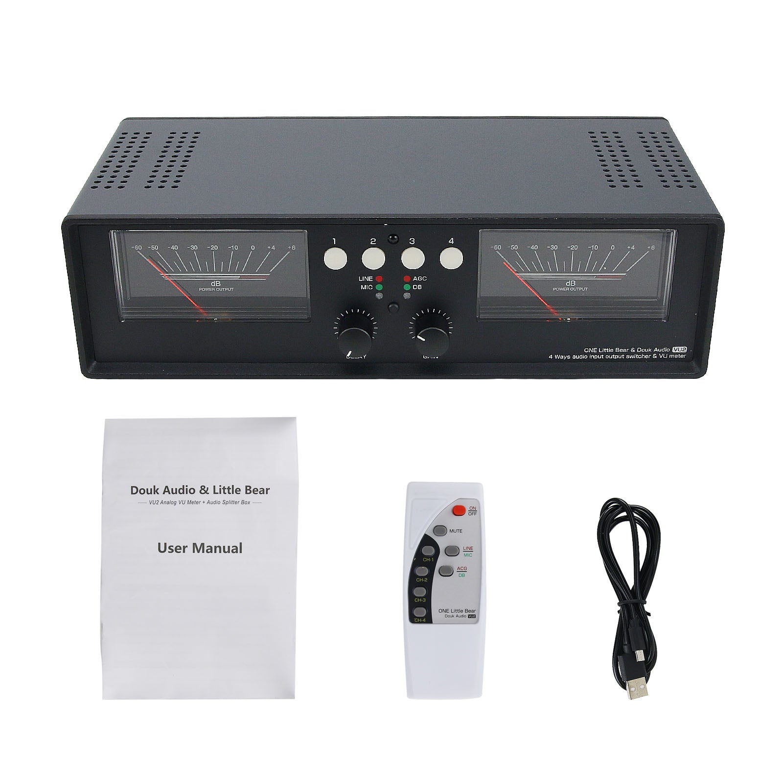This machine is powered via USB interface and can be connected to any USB charger. USB only supplies power to driver board, and has no interference to audio input and output circuits. The functions of VU meter and 4-way switcher are independently controlled. The VU meter only reads signals from the I/O port of switcher, as far as possible to ensure that the sound quality is not affected.