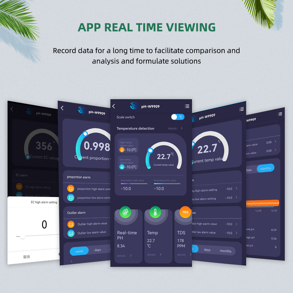 - APP alarm settings: Create smart scenes in an independent APP, set PH, temperature and other safety ranges. And select the alarm method, and a notification reminder will be sent when the safety range is exceeded. Escort your water quality products